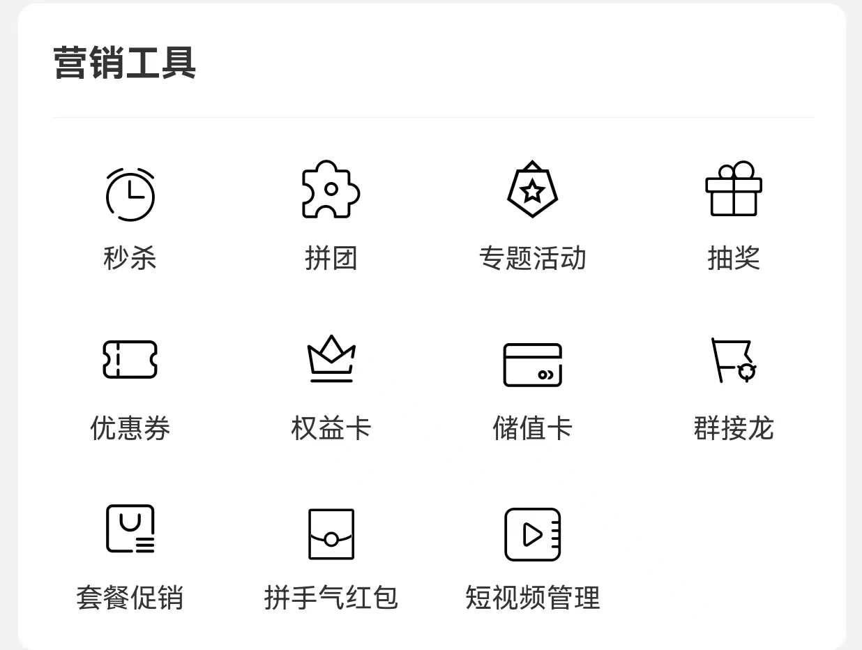 1、餐饮版:扫码点餐,堂食/外卖预购核销,移动收银,挂账,小票打印,自定义套餐促销,引流企微群,群会员优惠模式,优惠劵,拼团等常规营销玩法。