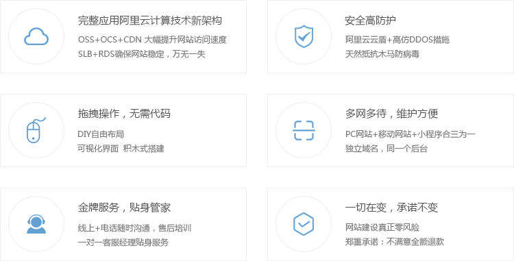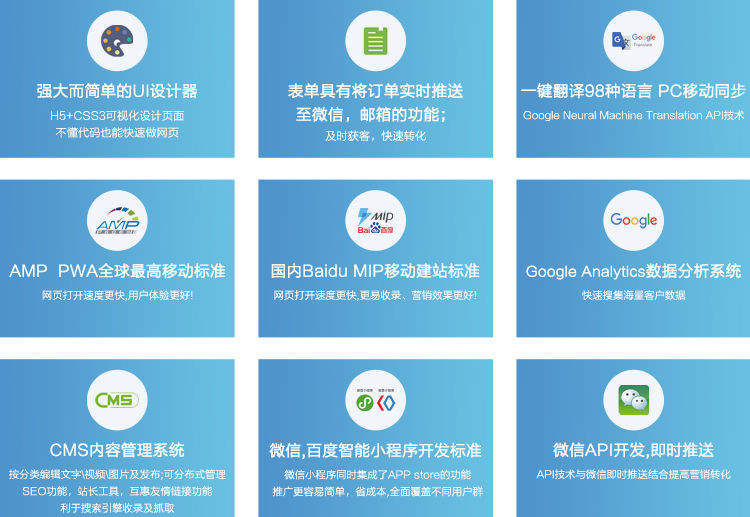 PC站、MIP手机站、小程序同一数据源易发布、易收录、易成交、易维护;终身免费升级、免费空间; 平台操作简单,用户通过在线的可视化编辑器制作个性 或使用行业模版创建PC站和MIP手机站,一键打包发布小程序序。三站合一同时 发布。手机网站采用百度先进的MIP技术规范和Google Analytics数据分析系统,最大化提升营销效果。是一家实现精准营销闭环的云平台
