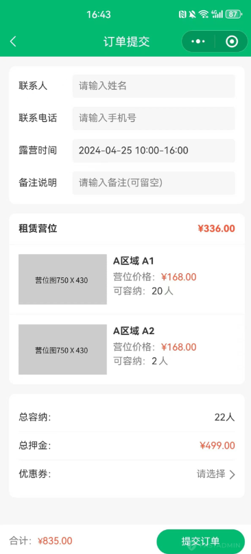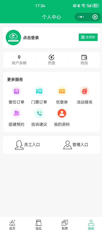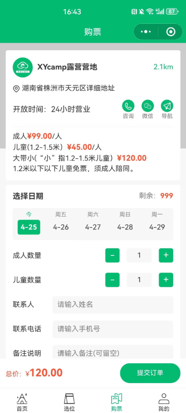 可编辑营地信息,设置营地门票价格,后台管理营地区域、场次、营位、基础服务。
