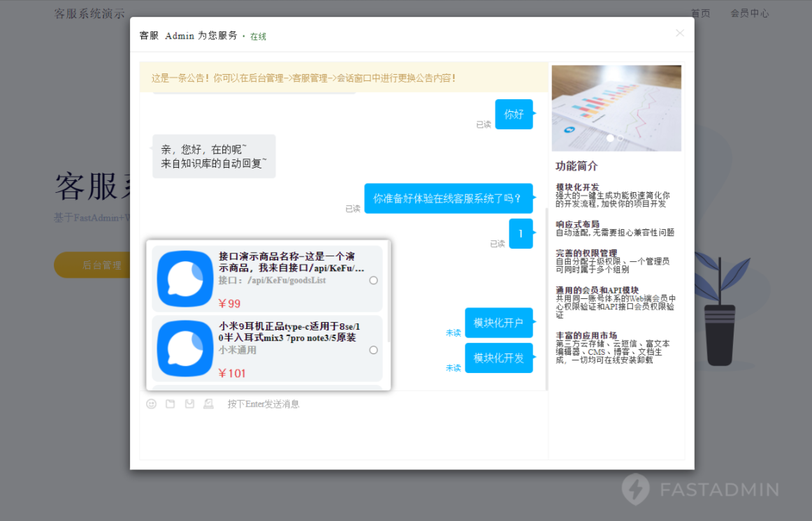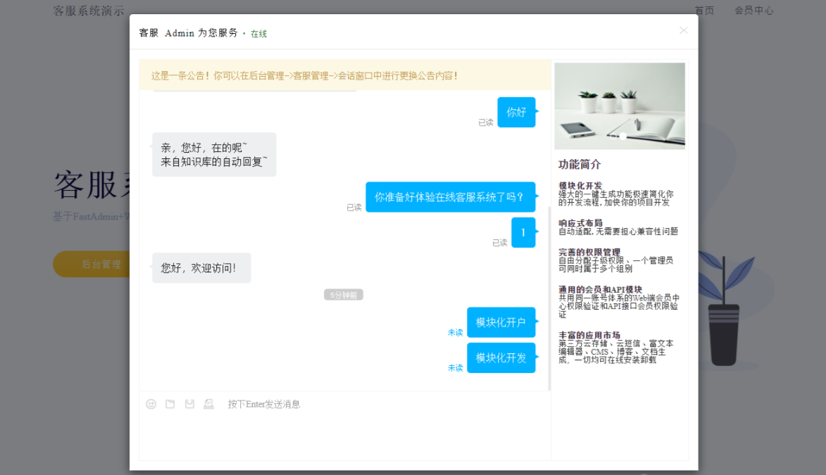 基于ThinkPHP5开发的一款实时在线客服系统,支持多客服(不限座席)、知识库、离线留言板、离线消息、历史会话、微信小程序接入、用户轨迹等功能,提供全部无加密服务端源码和前端源代码,独立部署,不受限制。