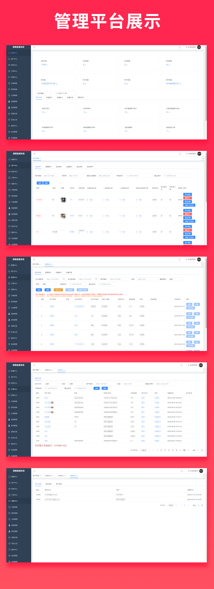 精准分类、动态管理、关注、认证中心、公会管理、礼物管理