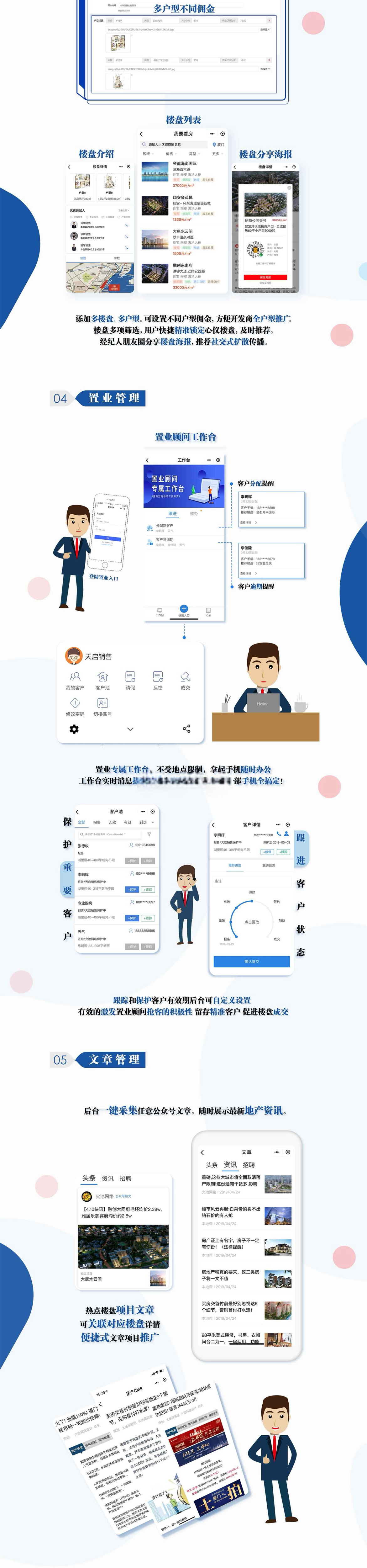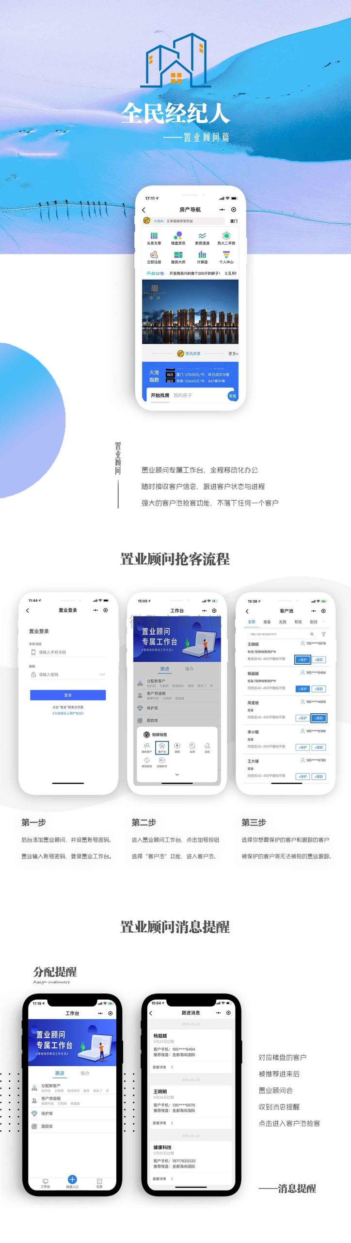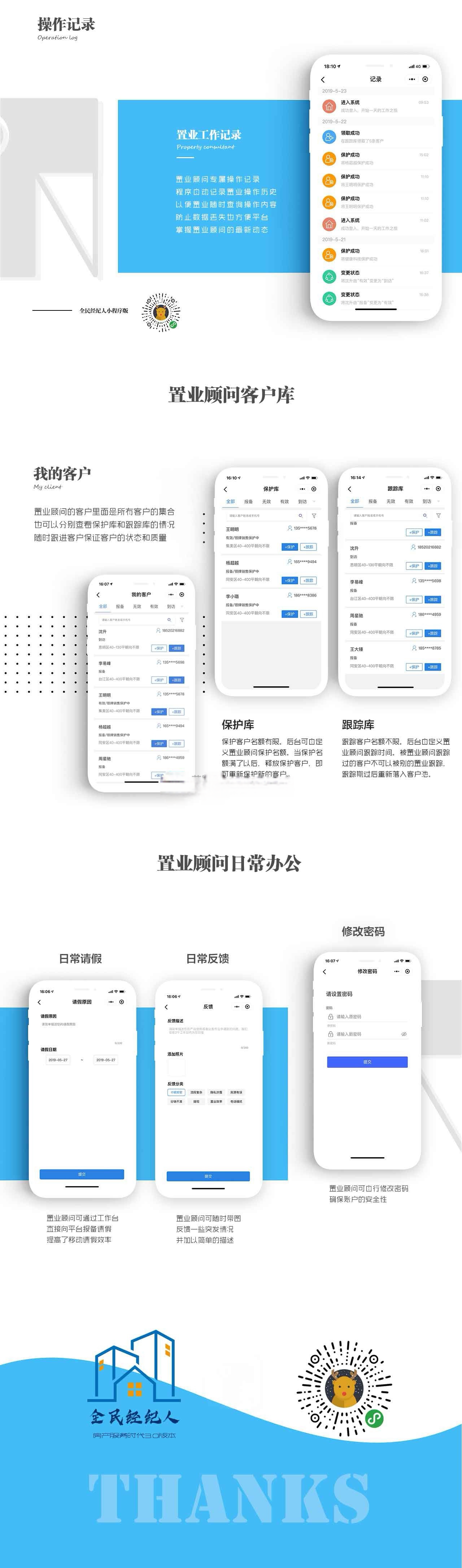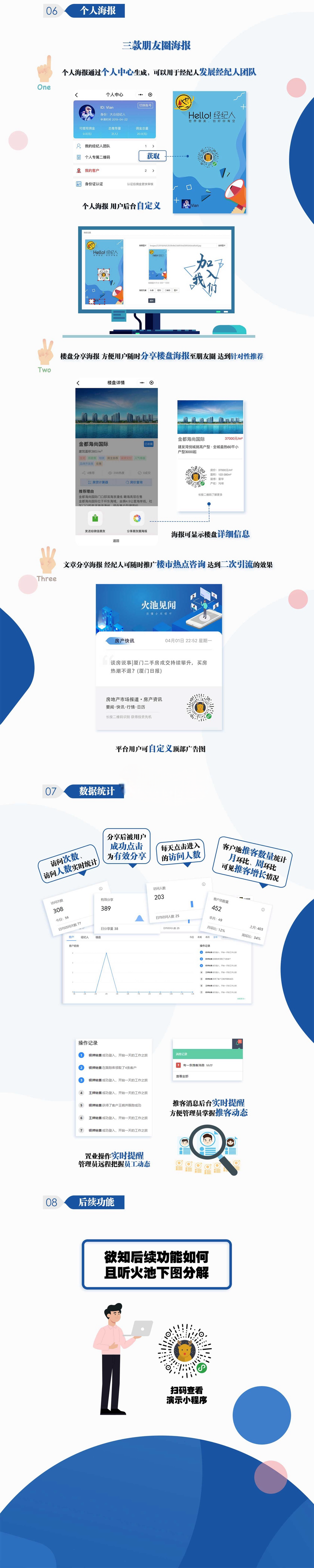 全民经纪人小程序是一款针对房产销售营销管理CRM系统,具有:“多项目”“多业态”“多机构”“多角色”“多层级”“全平台”“数据通道”“自定义”等8大产品功能优势,全面支持房产“全民经纪人”销售的各种模式,是目前市场上,功能全、易操作、房产服务行业3.0版本的强大营销系统平台。