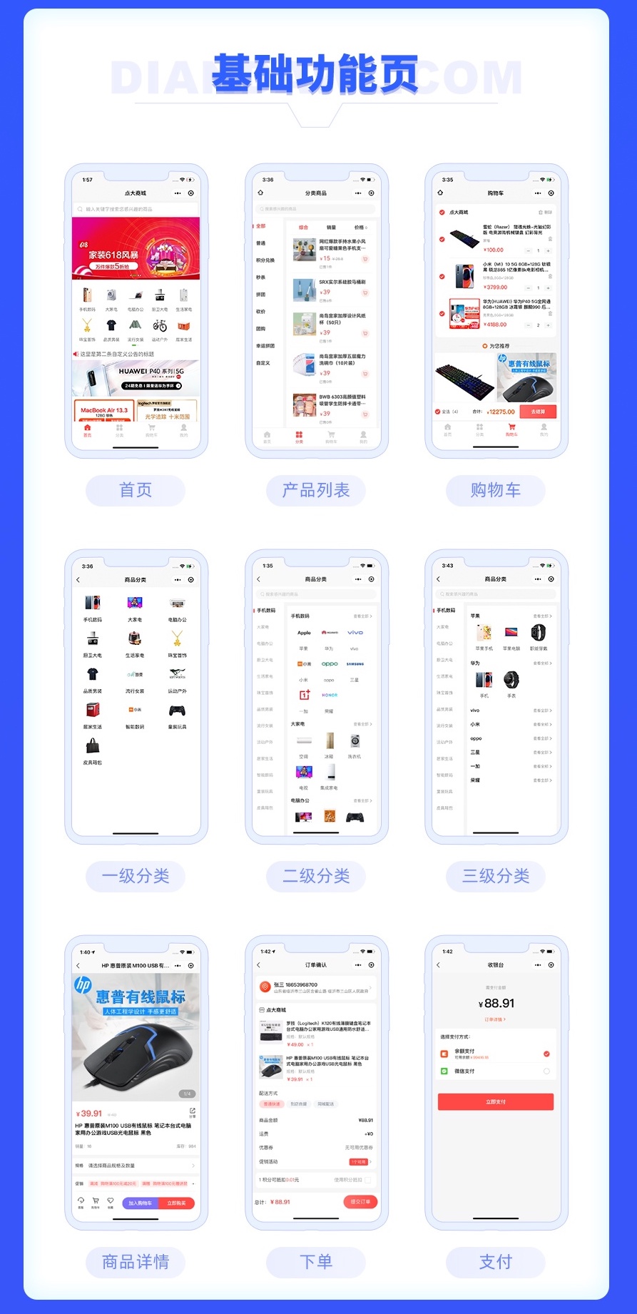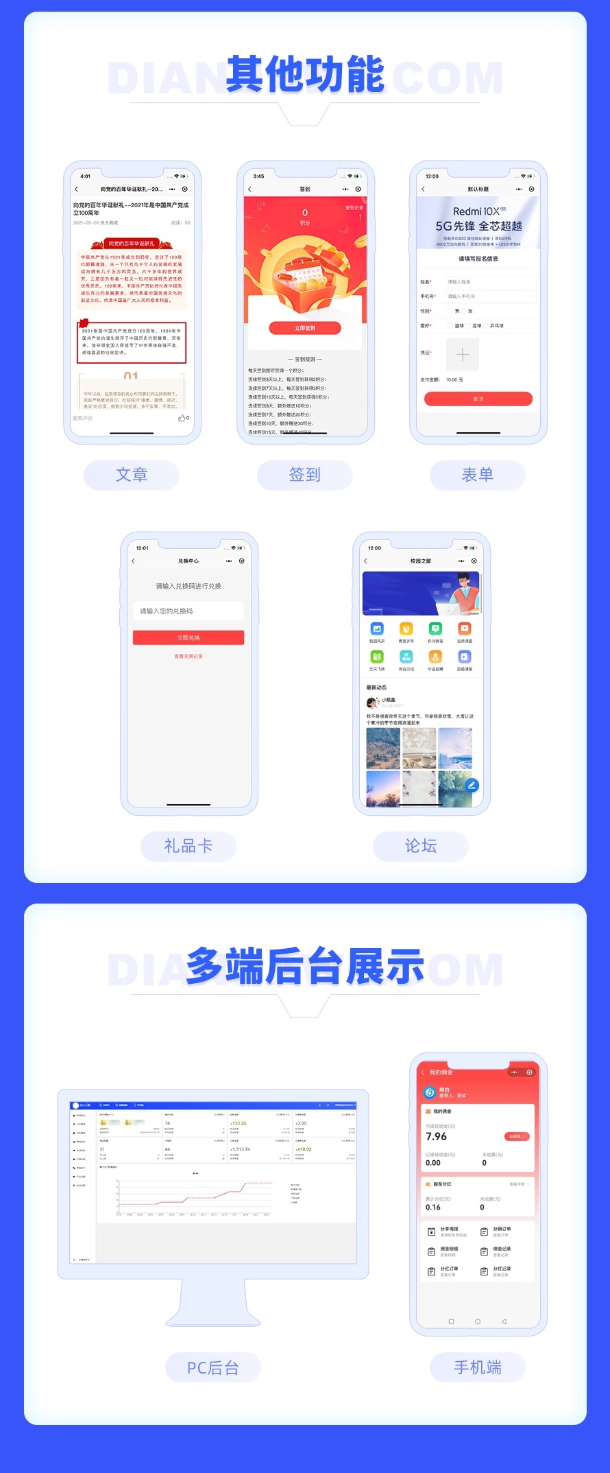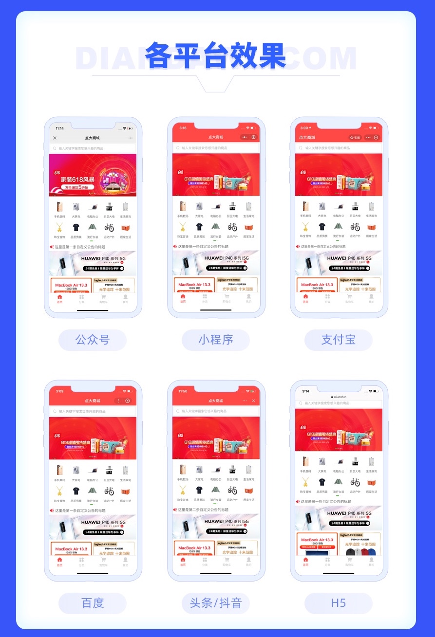 5、支持微信公众号、微信小程序、支付宝小程序、百度小程序、头条小程序、手机H5、手机APP多端同步。