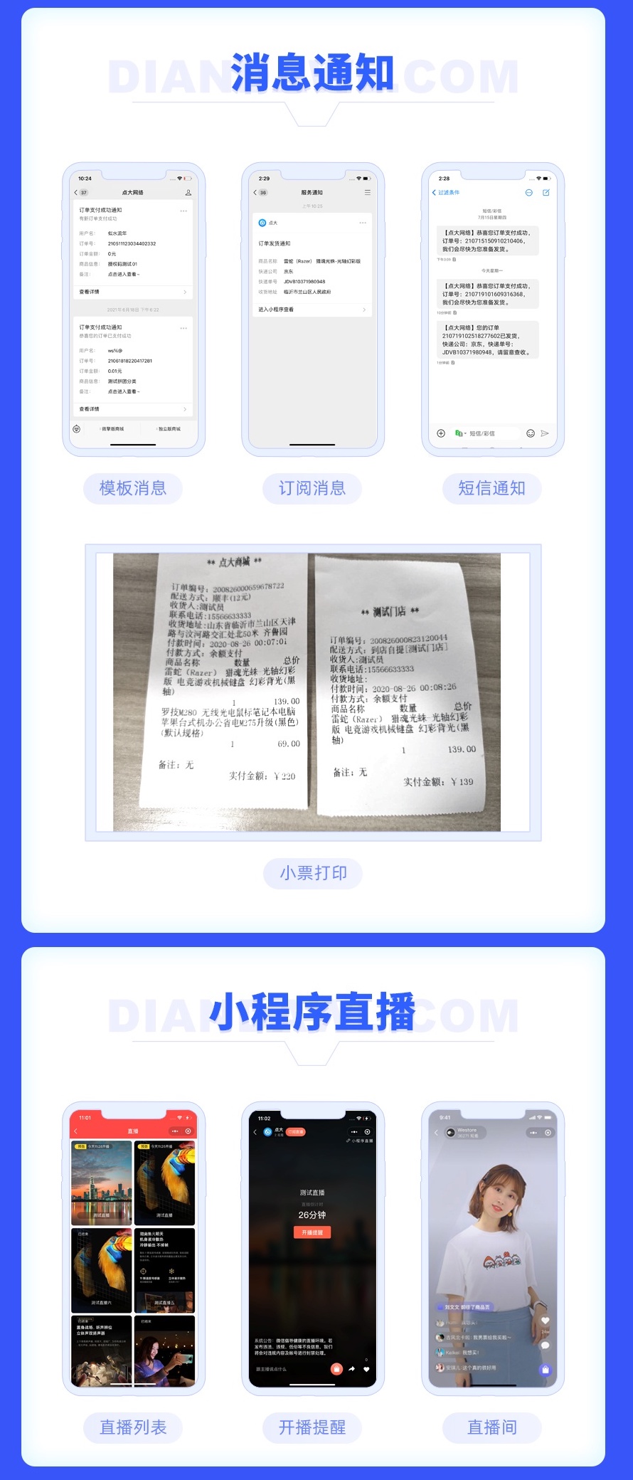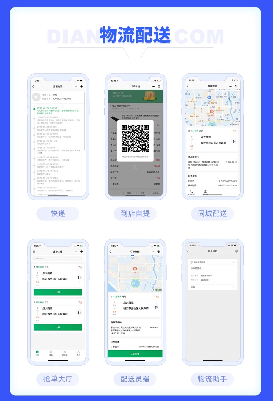 4、扩展功能支持供货系统、文章管理、用户论坛、同城配送、自定义表单、礼品卡兑换、短视频、物流助手、小程序直播等。