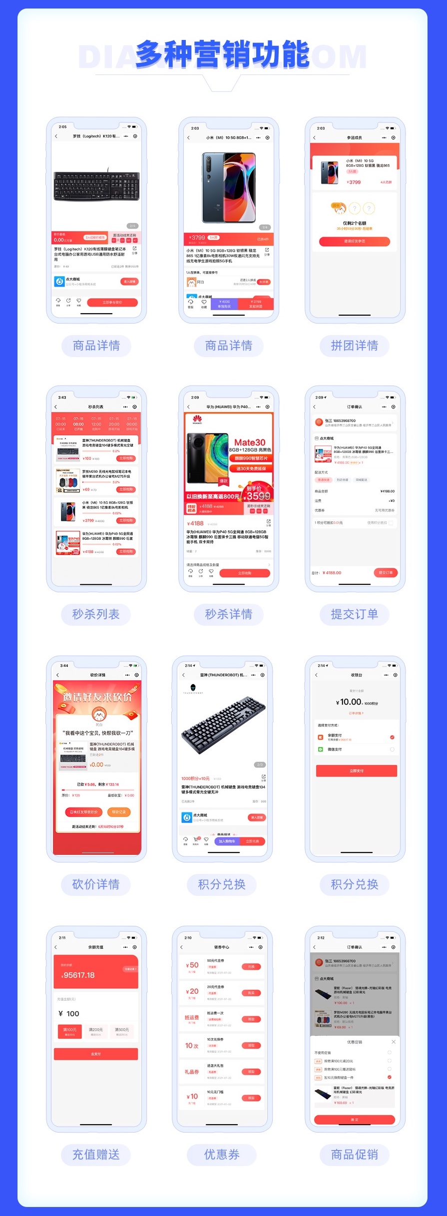 1、商品类型支持普通商品、积分兑换商品、秒杀商品、拼团商品、砍价商品、团购商品、幸运拼团商品、自定义商品,所有商品统一管理,订单统一管理,更加方便快捷。