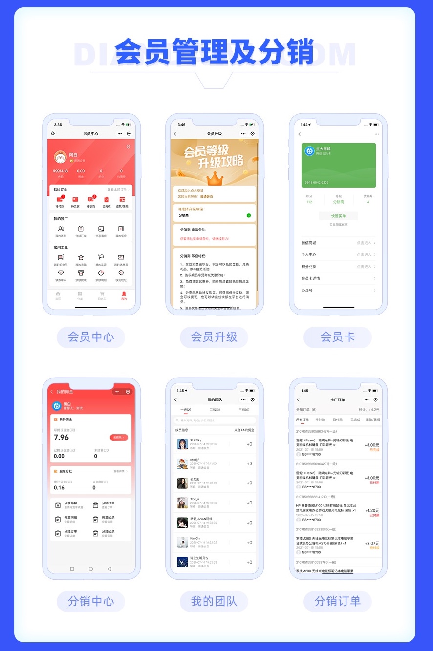 6、支持三级分销、团队分红、股东分红、区域代理分红、团队分红级差、商品等级级差分销等,支持会员等级前端申请及设置条件自动升级。
