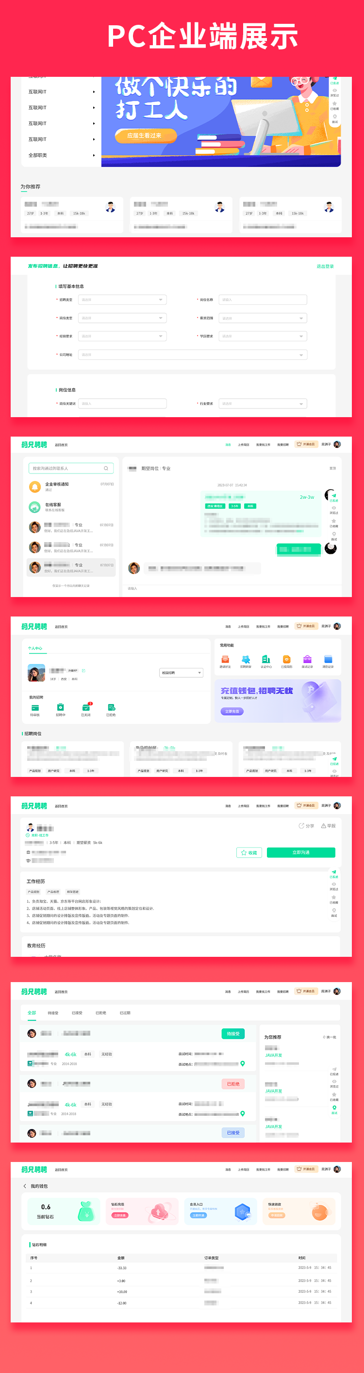 本系统主要帮助人力资源公司管理招聘简历等信息,目前已上线,同boss类型,适配支持微信小程序,h5 ,APP ,支持企业入驻 简历投递 在线聊天 简历发送