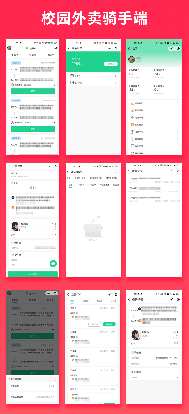 骑手认证,保证金缴纳,提现,接单池,接单设置,个人中心,截单池,接单详情,实名制,收益统计,培训中心,资金管理,我的评价,违规申诉,联系客服,用户协议,隐私政策,我的订单,订单明细,保证金管理,提现功能,缴纳保证金,退还保证金