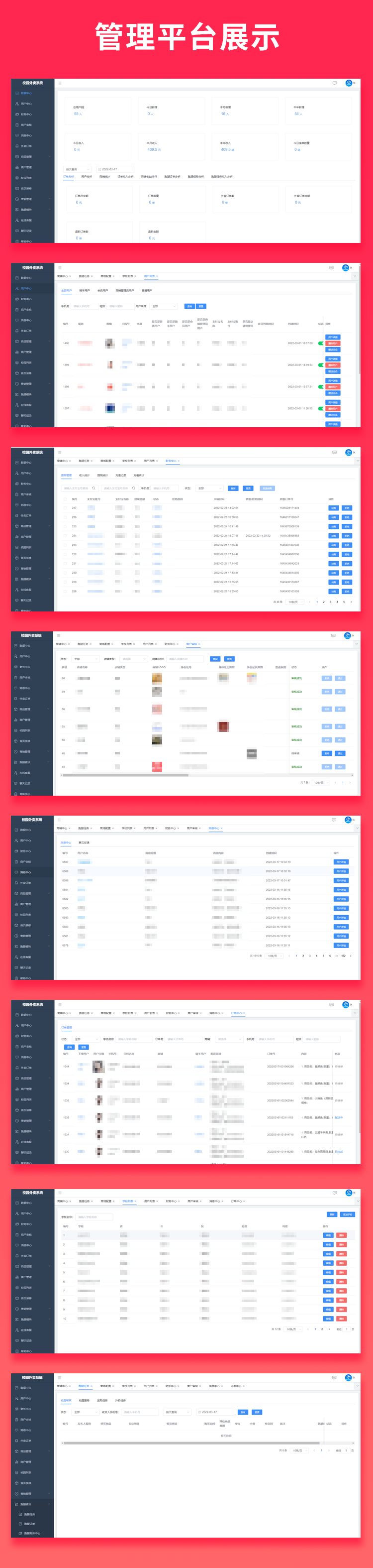 每个学校有个负责人把学校商家入驻到系统里,商品录入到平台,指定关联接单人和学校,商家周边或者校园里面的