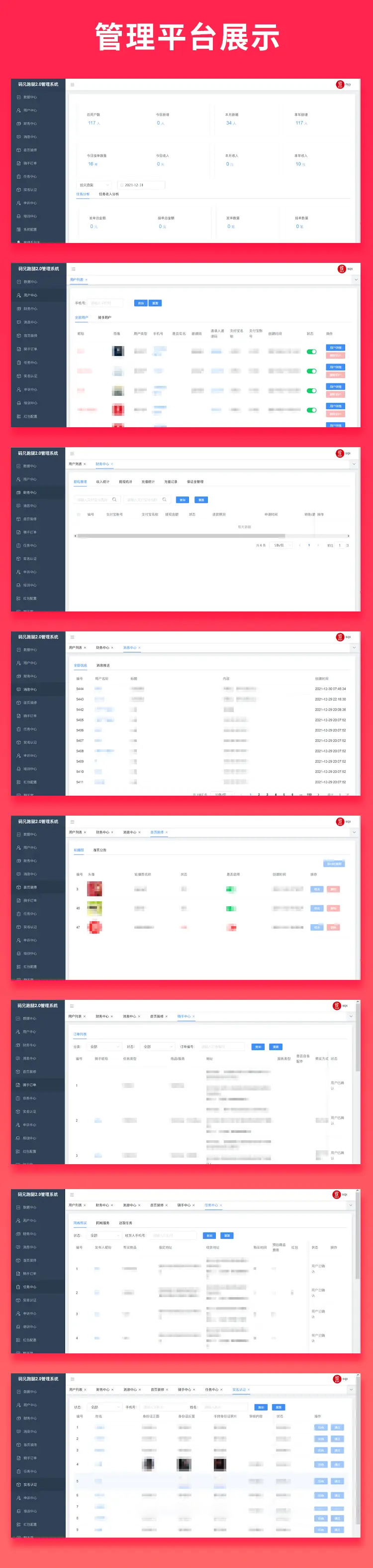 首页支持切换地图模式,新增多类型跑腿,新增实时骑手位置,适配APP,适配公众号,优化产品功能,管理端新增各类数据统计功能等,前后更新10个小版本,骑手端帮助中心,骑手模块,保证金等系列功能升级优化,管理端跑腿端联系客服体验,源码交付支持二开