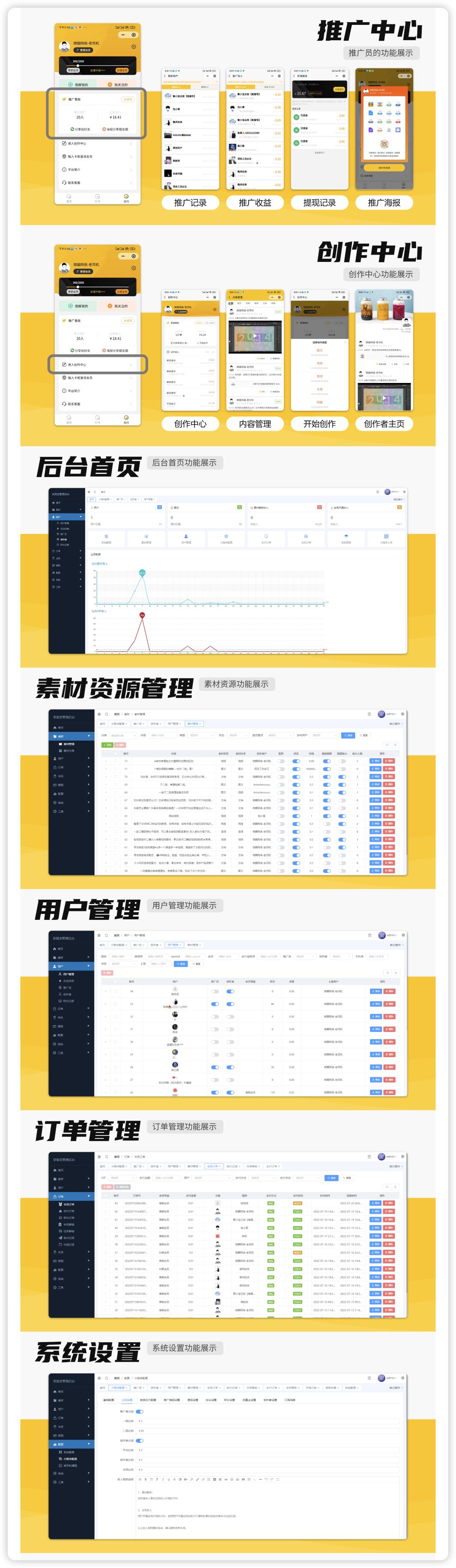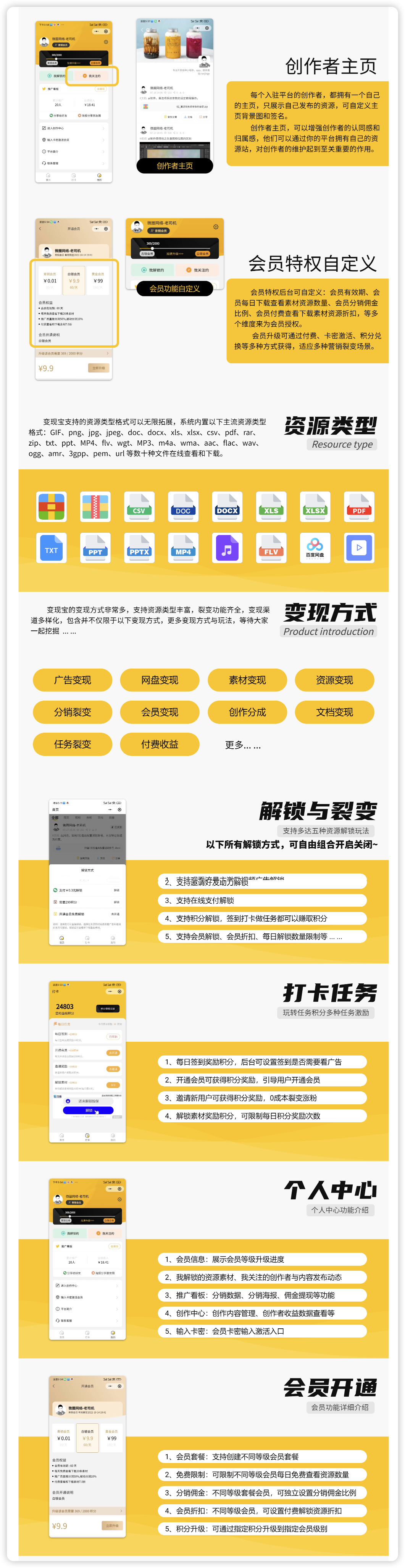系统支持用户申请成为创作者,贡献发布自己的资源,对于没有资源但是有人脉的客户来讲,简直就是赚钱神器,用别人的资源,赚自己的钱。后台可控制允许用户发布的资源类型,以适应自己的运营需要。