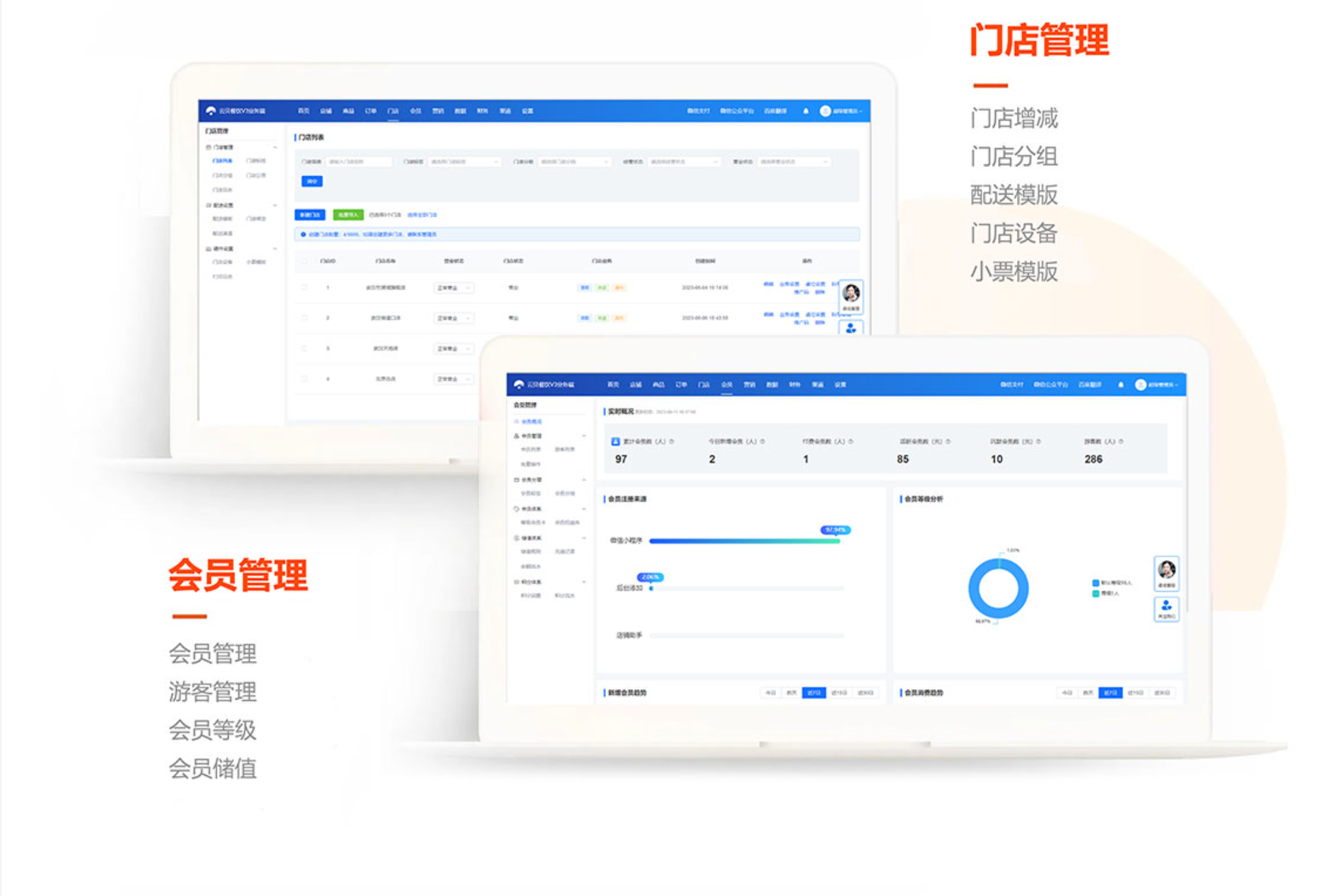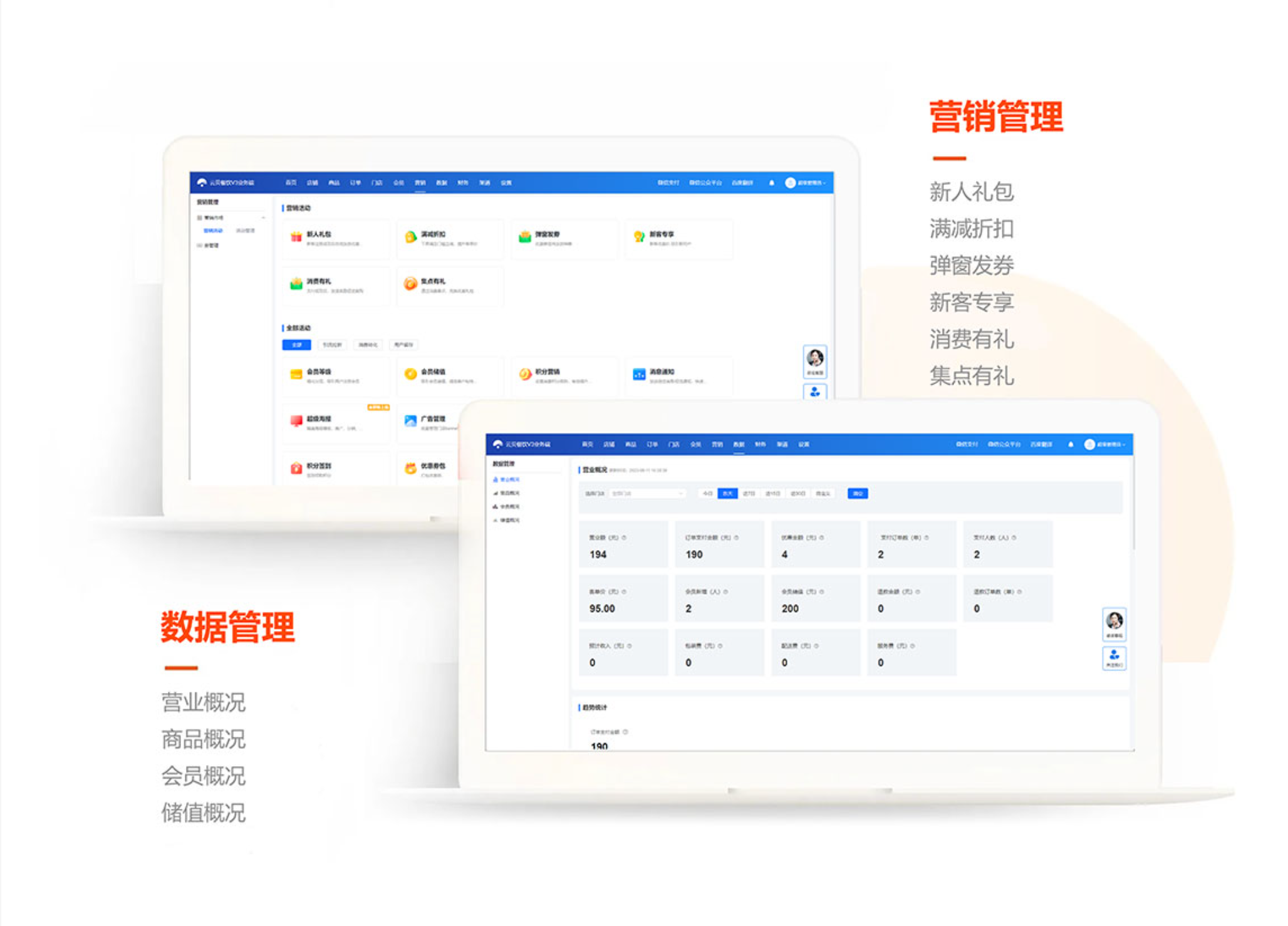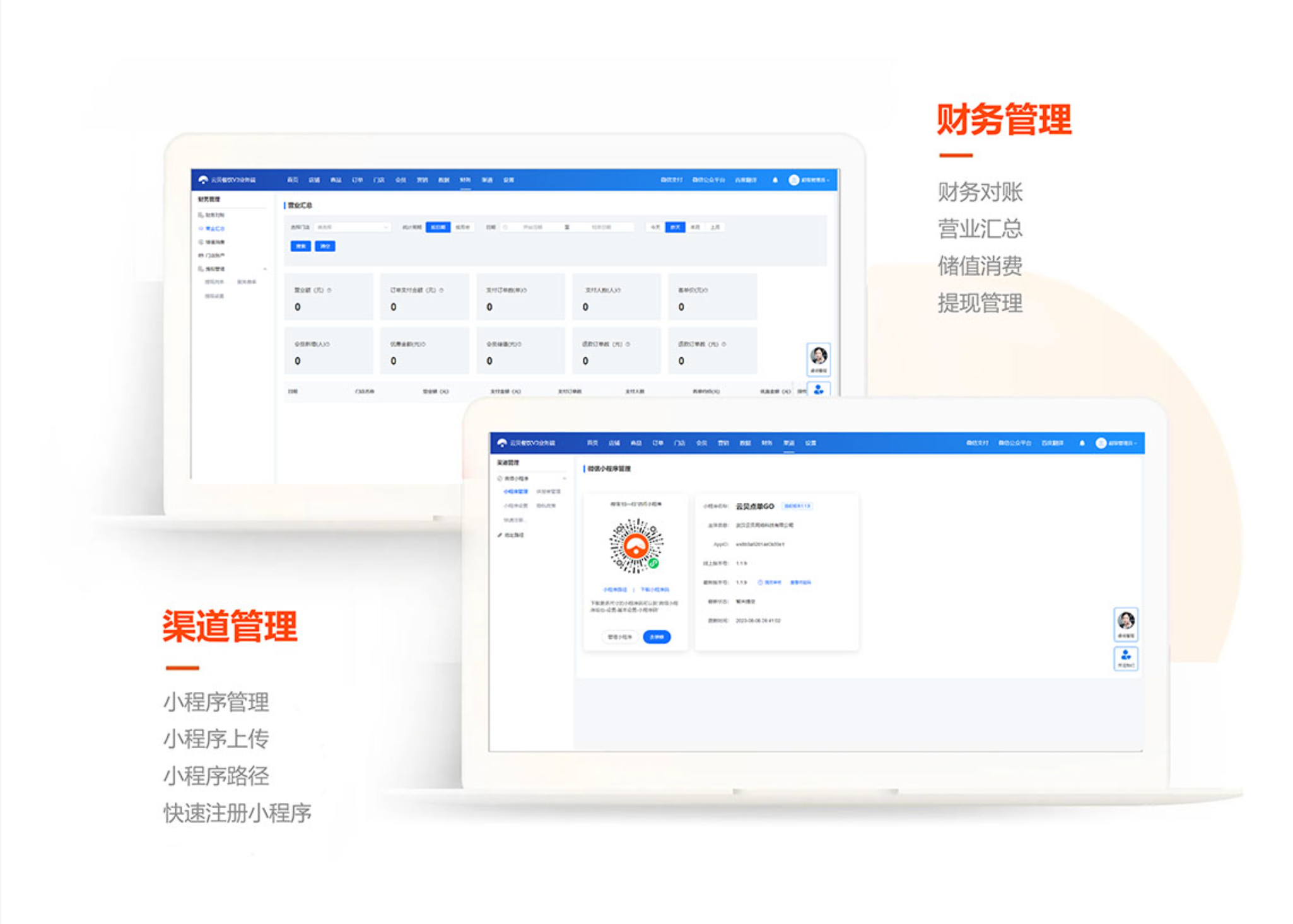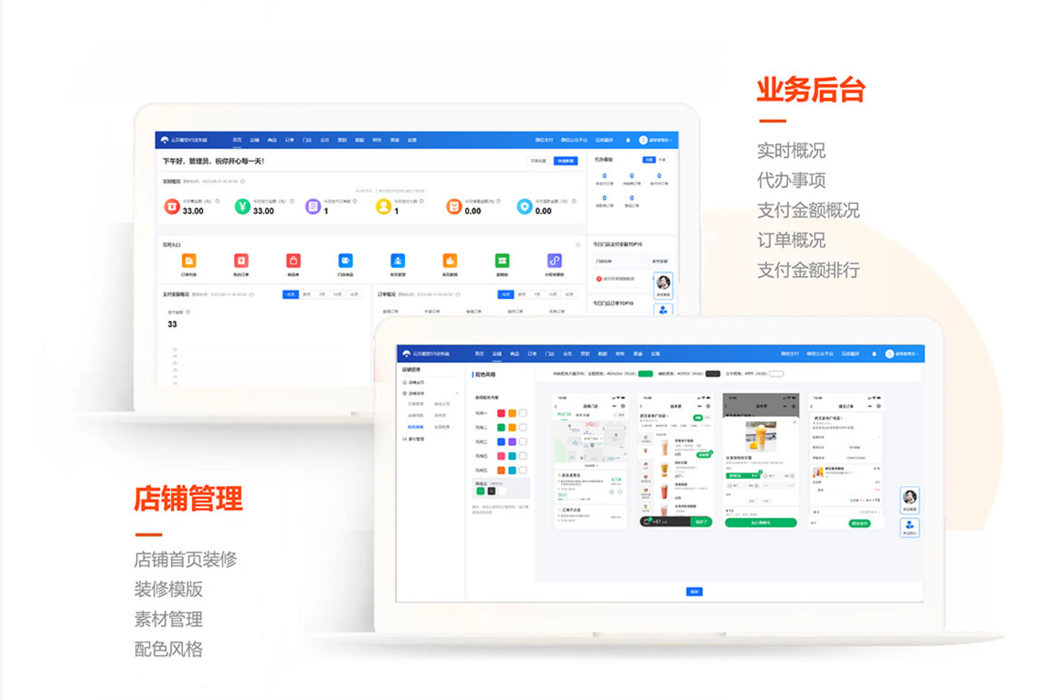 - 实时掌握门店销售数据,营业监控,库存信息,提升管理效率及决策及时性,移动化管理门店日常业务;管理订单、餐桌管理、商品上下架、财务对账、营销活动。