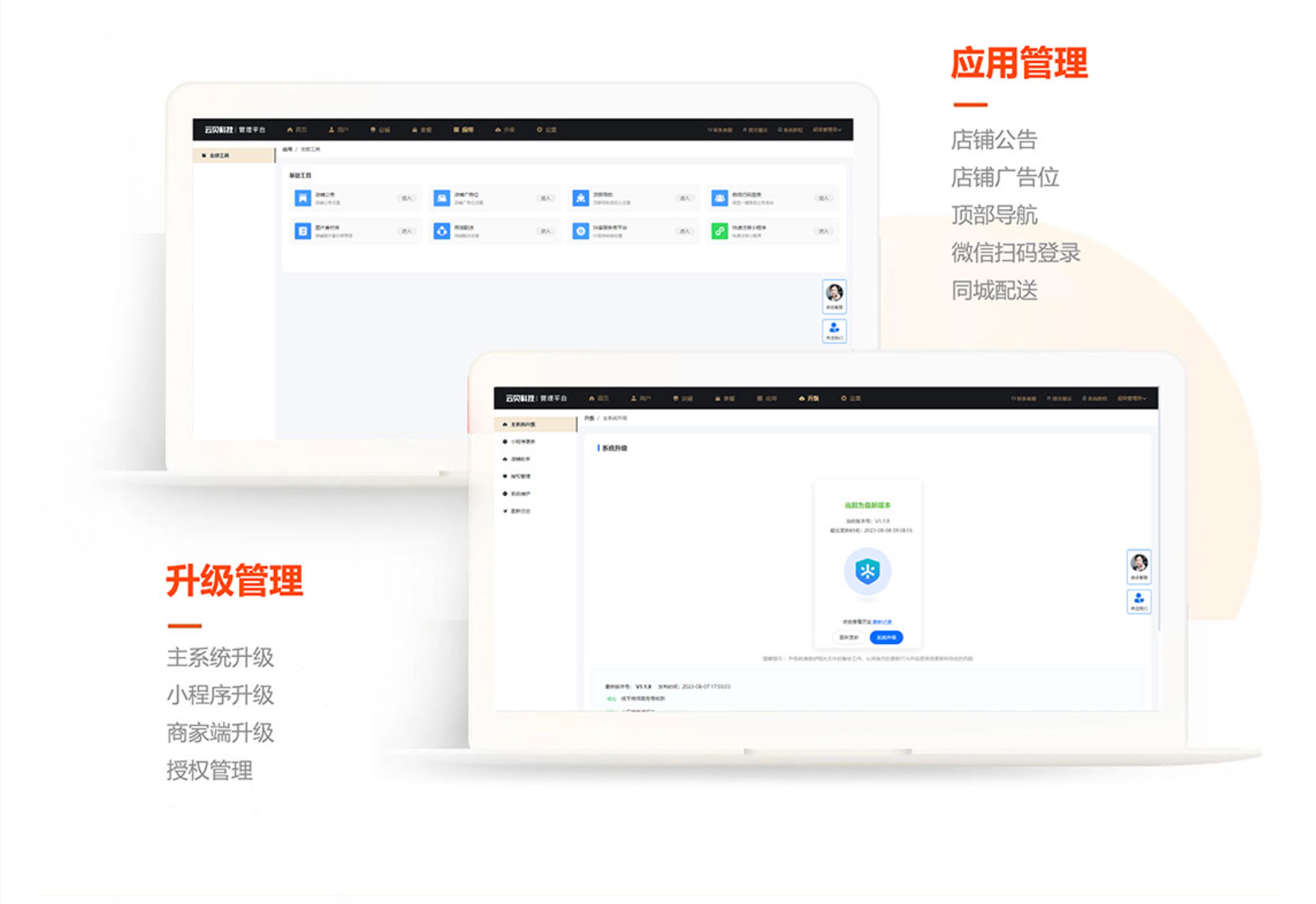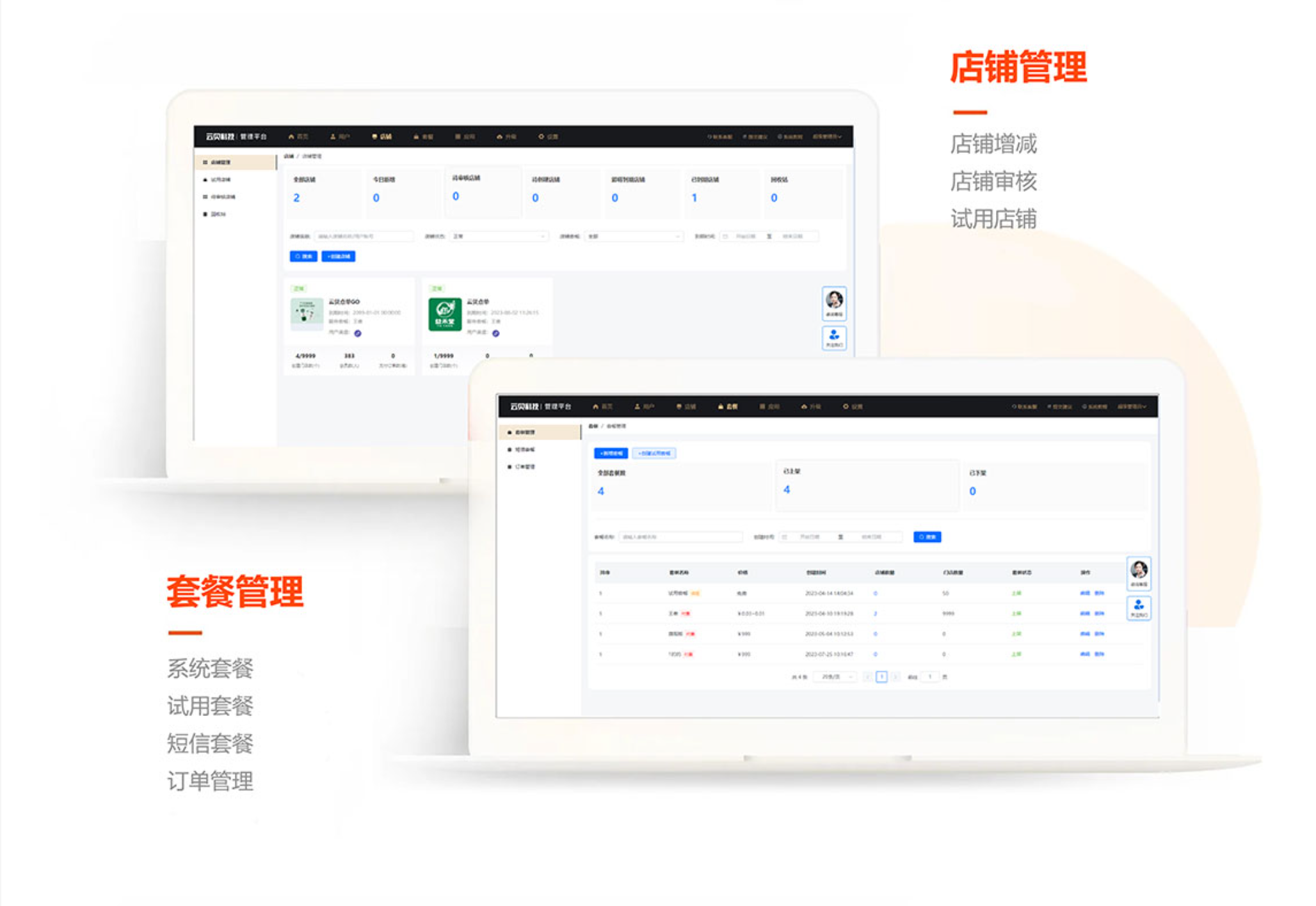 - 颠覆传统系统模版,开启新纪元。可OEM贴牌,自助注册SAAS账号,开启套餐收费,开放平台一键上传小程序,批量管理用户、续费、短信购买、聚合配送、服务商抽佣等一系列功能。