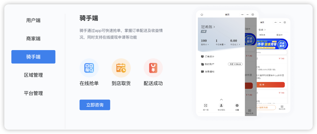 骑手通过app可快速抢单,掌握订单配送及收益情況,同时支持在线提现申请等功能