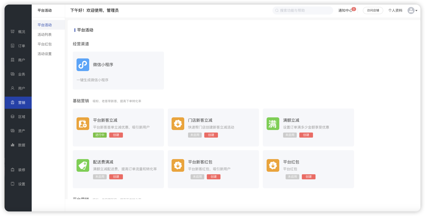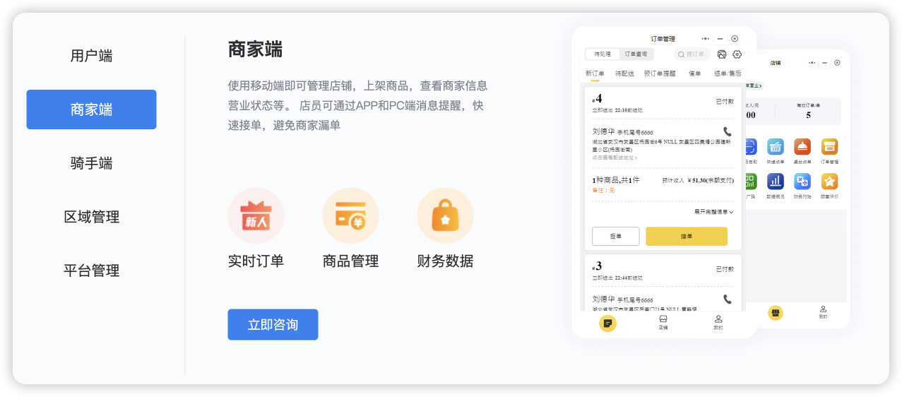 使用移动端即可管理店铺,上架商品,查看商家信息营业状态等。店员可通过APP和PC端消息提醒,快速接单,避免商家漏单