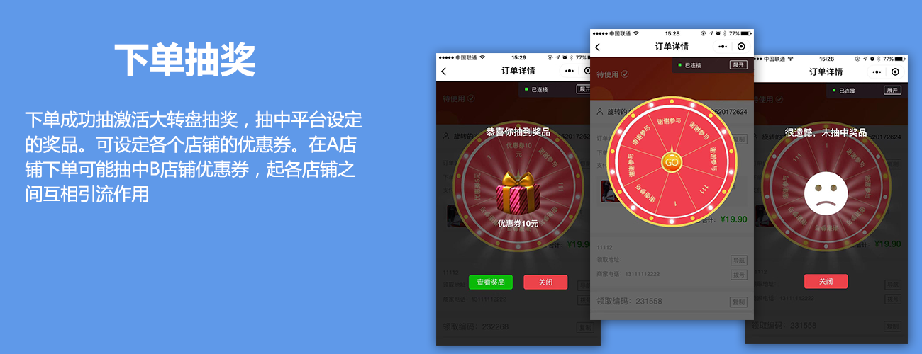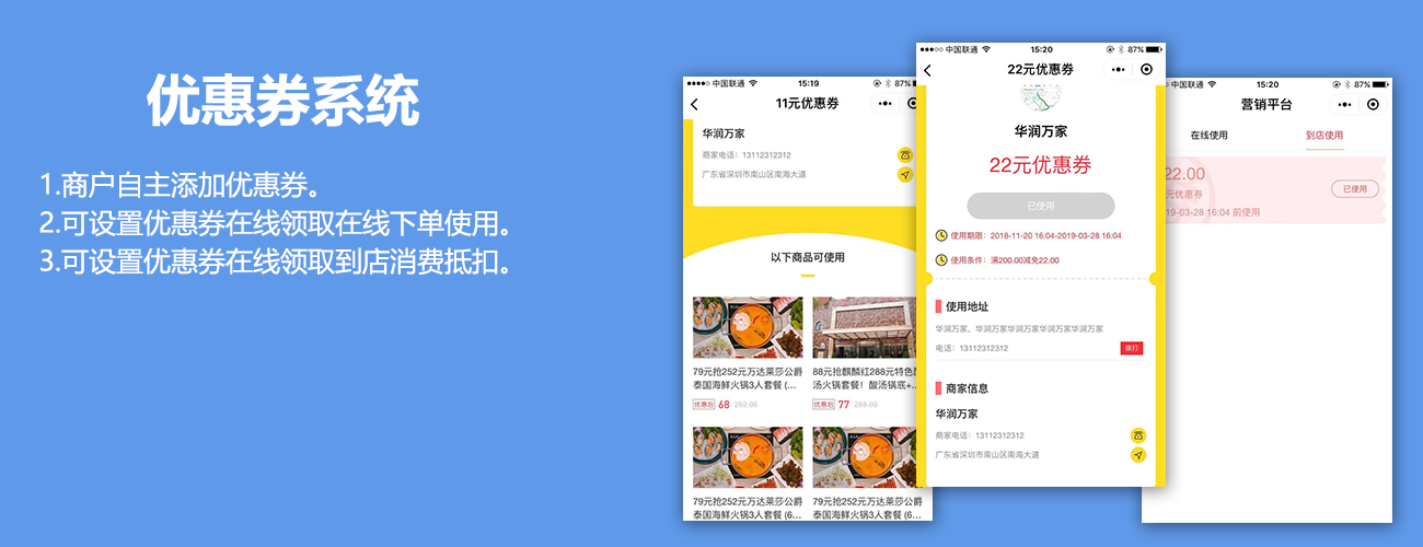 2.能做大型城市电商平台(用户下单,用户根据提示到店使用或获得折扣,核销员核销订单完成),为线下门店做活动,以分销促使商品区域化传播,实现店铺曝光引流