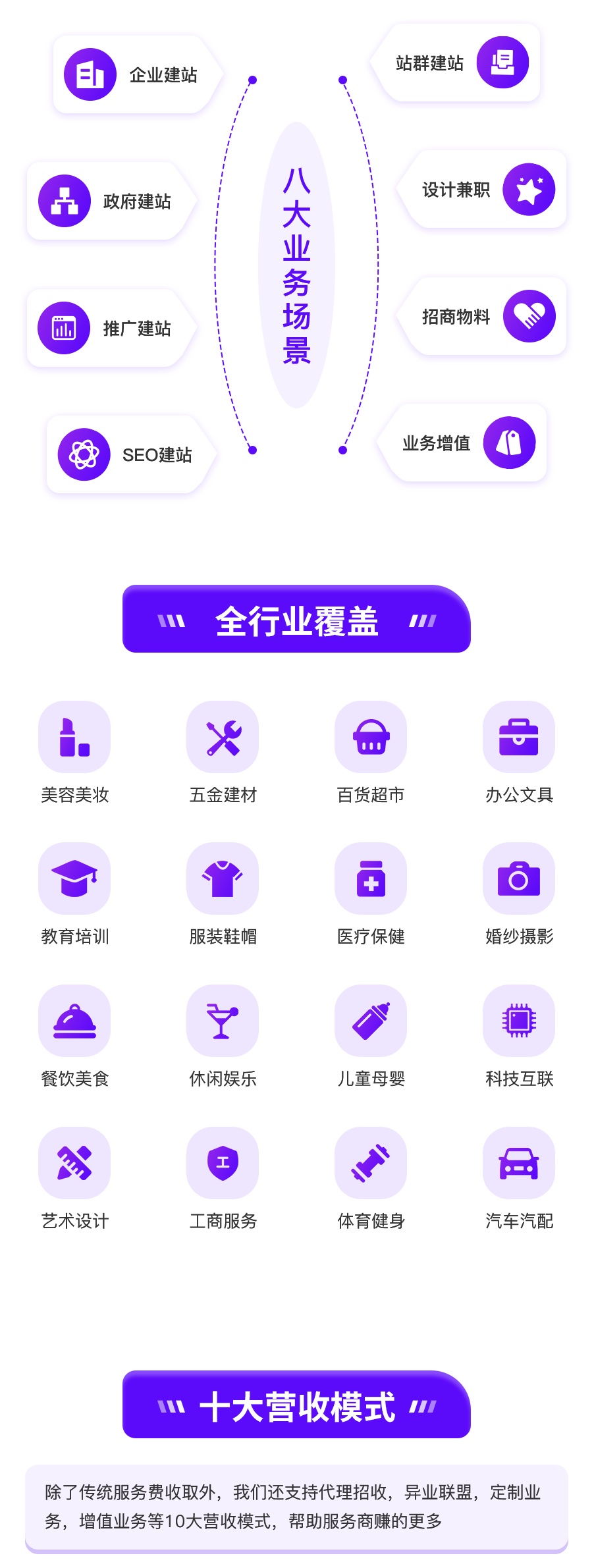 壹佰智慧轻站2.0是一款帮助用户极速建站的产品,支持海量模板一键更换,无需代码,DIY自由拖拽,轻松设计出心仪网站;PC、微信、支付宝、QQ、头条、H5等全平台覆盖,一键生成全端同步;千套模板全场景覆盖,为各行业提供高效的网站建设服务;官方品牌保障,让用户拥有快速安全稳定的网站后台,同时支持多种盈利模式,让服务商赚取更多收益;丰富多样的插件,千站站群、预约管理、留言管理、表单管理等多项功能,让互联网功能更加强大