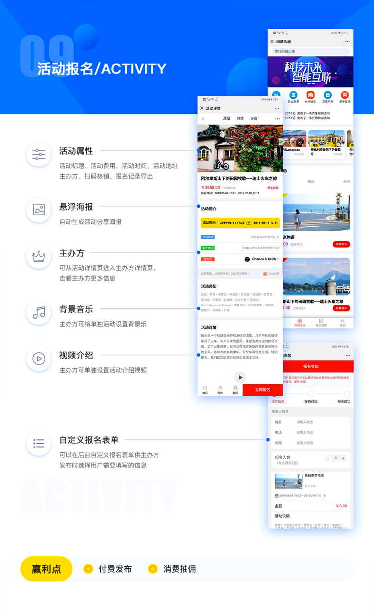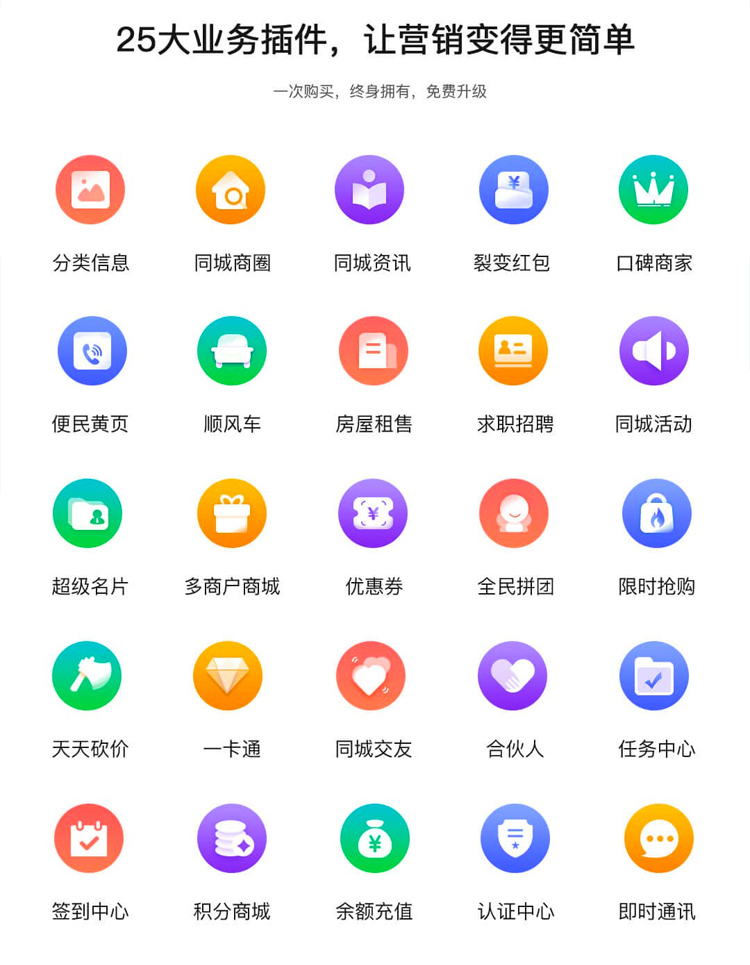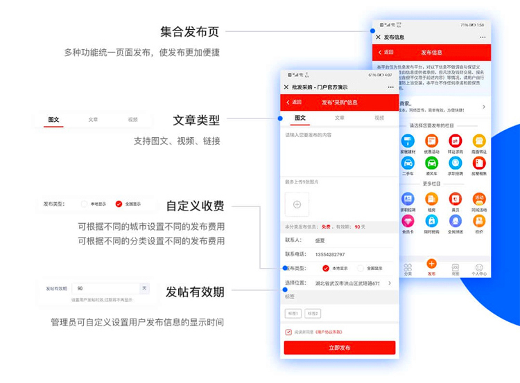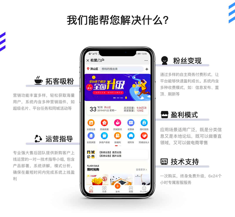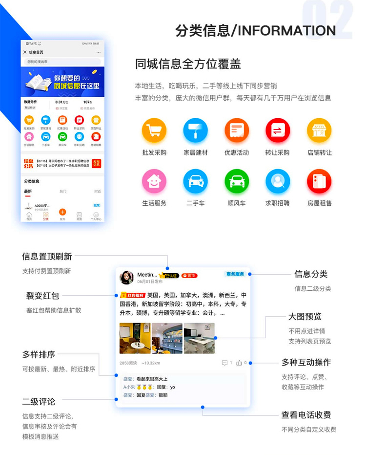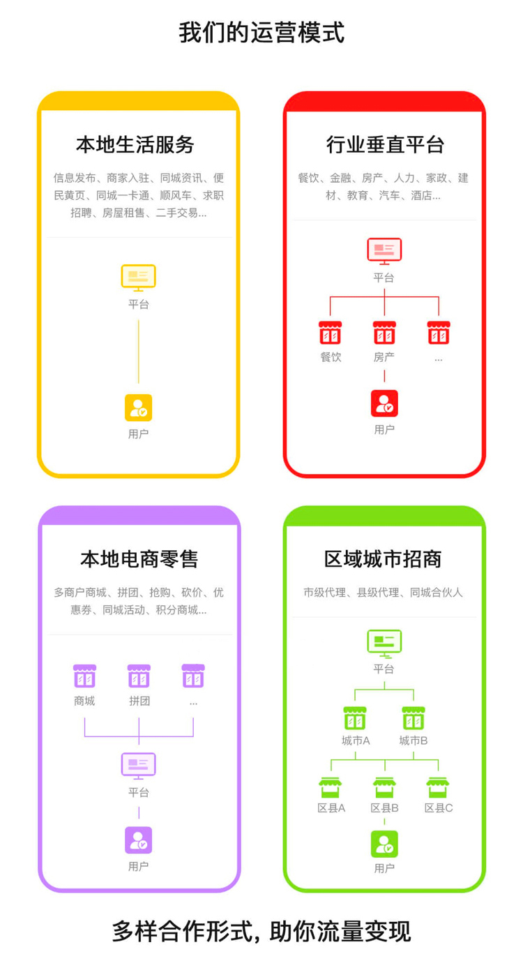汇聚招聘求职、房产交易、车辆买卖、闲置二手、宠物服务等同城便民分类大全,打造本地最全的同城服务平台。为本地商家或企业提供网上黄页店铺,及点评、问答、活动等社会化互动营销工具,通过互联网可有效的改善传统行业经营模式。为本地网友提供交友互动、分享生活点滴的平台,有本地贴吧、生活秀、兴趣圈子、同城活动等产品,为门户站增加用户活跃度。一个成功的线下活动对于网站聚集用户、提高流量、提升人气、扩大宣传、开拓业务都有非常重要的作用。我们针对房产、家居、招聘、婚嫁等不同行业开发不同的活动营销工具,盟友可以通过线上和线下结合举办活动。