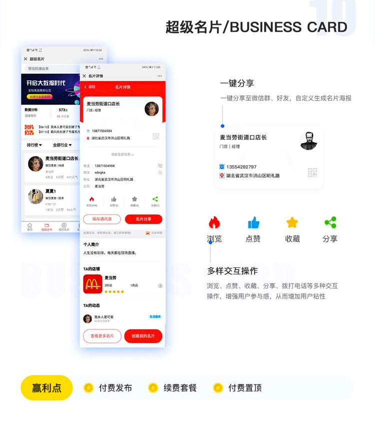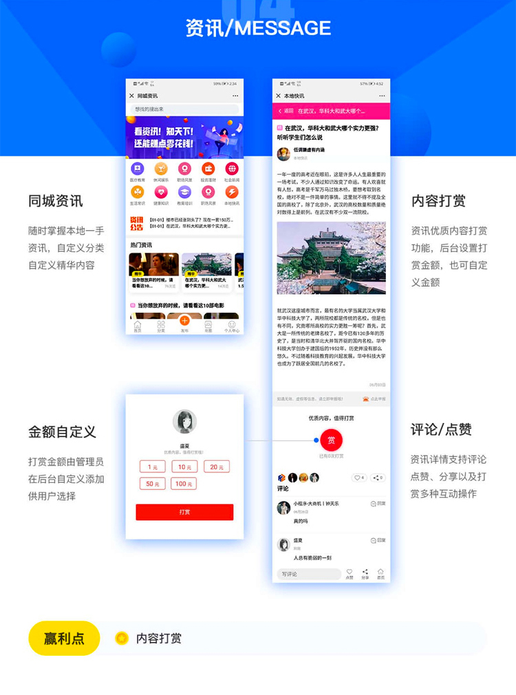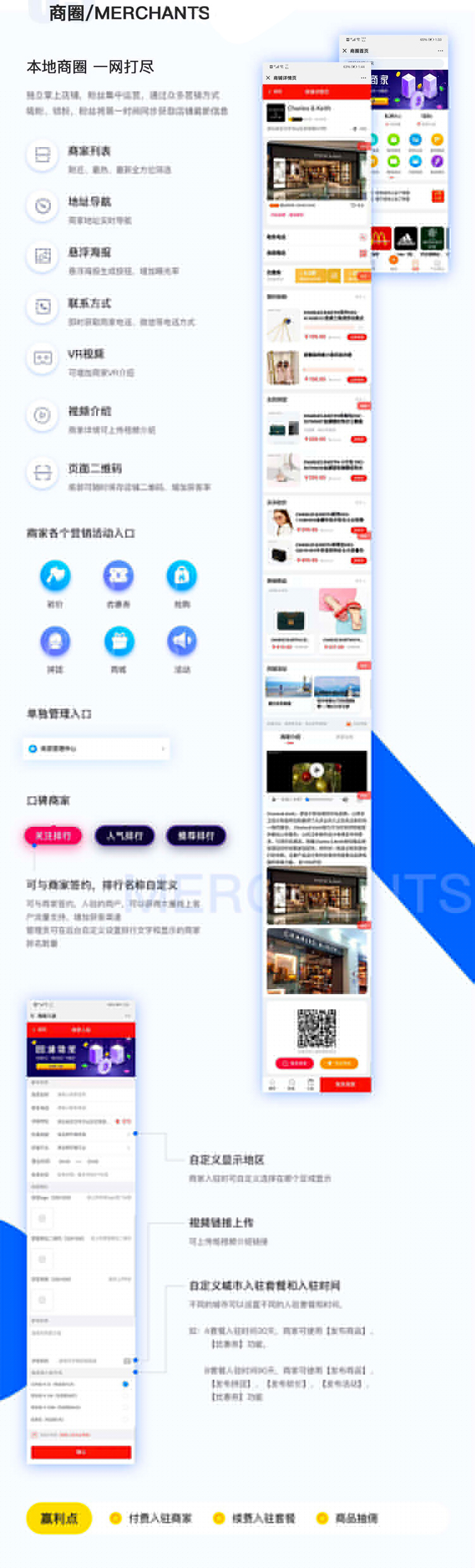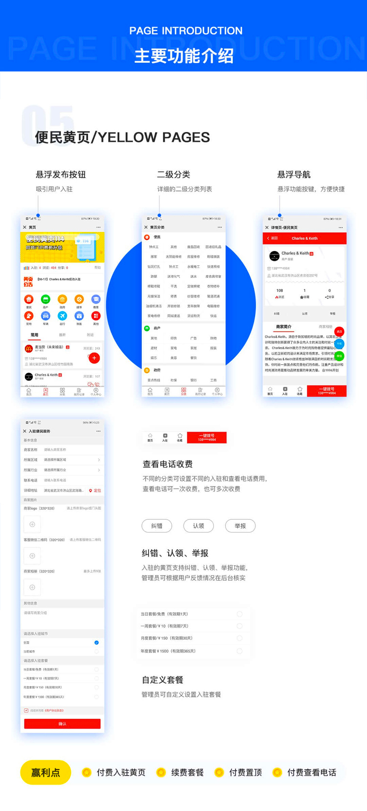 汇聚招聘求职、房产交易、车辆买卖、闲置二手、宠物服务等同城便民分类大全,打造本地最全的同城服务平台。为本地商家或企业提供网上黄页店铺,及点评、问答、活动等社会化互动营销工具,通过互联网可有效的改善传统行业经营模式。为本地网友提供交友互动、分享生活点滴的平台,有本地贴吧、生活秀、兴趣圈子、同城活动等产品,为门户站增加用户活跃度。一个成功的线下活动对于网站聚集用户、提高流量、提升人气、扩大宣传、开拓业务都有非常重要的作用。我们针对房产、家居、招聘、婚嫁等不同行业开发不同的活动营销工具,盟友可以通过线上和线下结合举办活动。