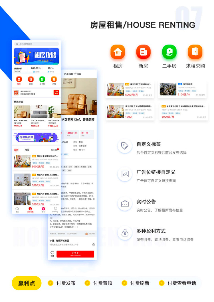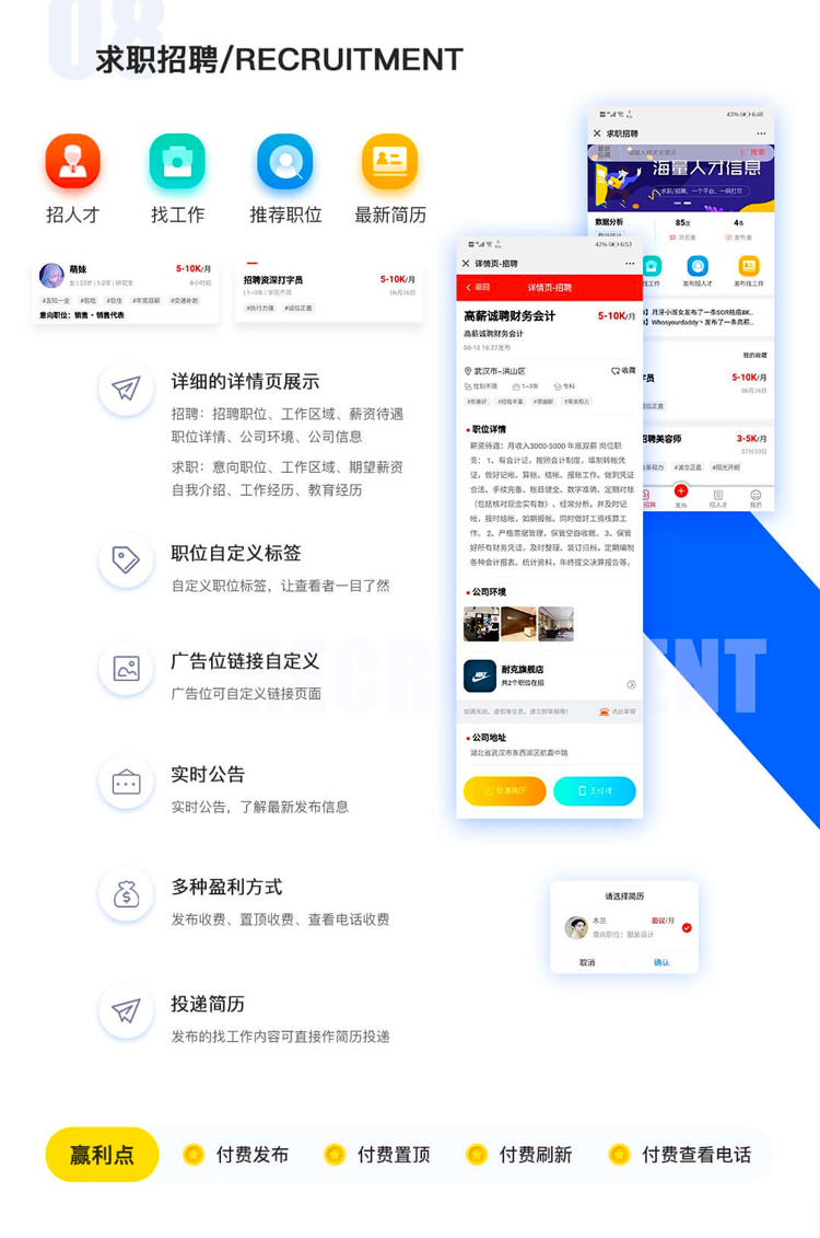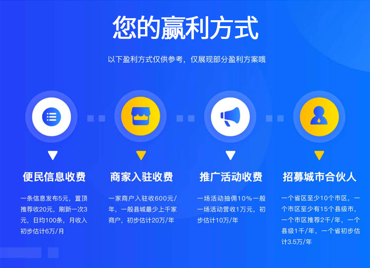其中PC门户体系可以通过品牌广告推广营收,大概占收入的15%;房产频道可以通过房产开发商(大金主)做新楼盘推广主页面,二手房、租房、中介主页推广,楼盘品牌广告,看房团等创收,整个房产频道营收大概能占到35%;人才频道通过和当地商家企业合作招聘获得佣金,还有名企招聘推广,查看简历库、线下线上结合招聘会获得收益,大概能占到30%的收入;生活惠选频道可以和当地商家企业进行社会化营销推广获得收益,还有商家黄页品牌推广,活动推广,这一块潜力巨大,也能获得20%-30%的收益。当然不同站点运营的侧重点不同,盈利点也就不同。同时移动端(微信小程序、公众号版、wap版、APP)也有相应的盈利点,