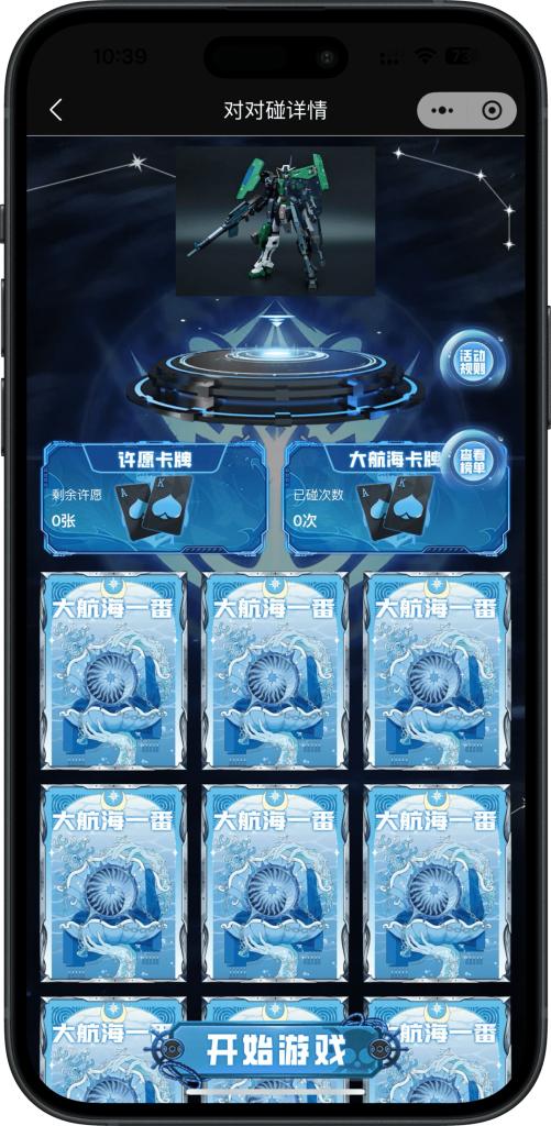 6.对对碰模式:玩家需在初始场上的9个随机赏品中寻找相同项进行两两对碰,对碰成功后二者消失并由系统补充新赏品;当无法继续对碰时,玩家可手动从许愿池(开局自选1个许愿赏品放入)加入赏品以延续游戏,若许愿池为空则游戏结束获得碰次奖品,其核心机制融合“消消乐”规则。类似于用户购买盲袋后,主播直播拆盒并触发对碰操作——每成功对碰一次计数增加,系统按累计对碰次数发放对应碰次奖品。
