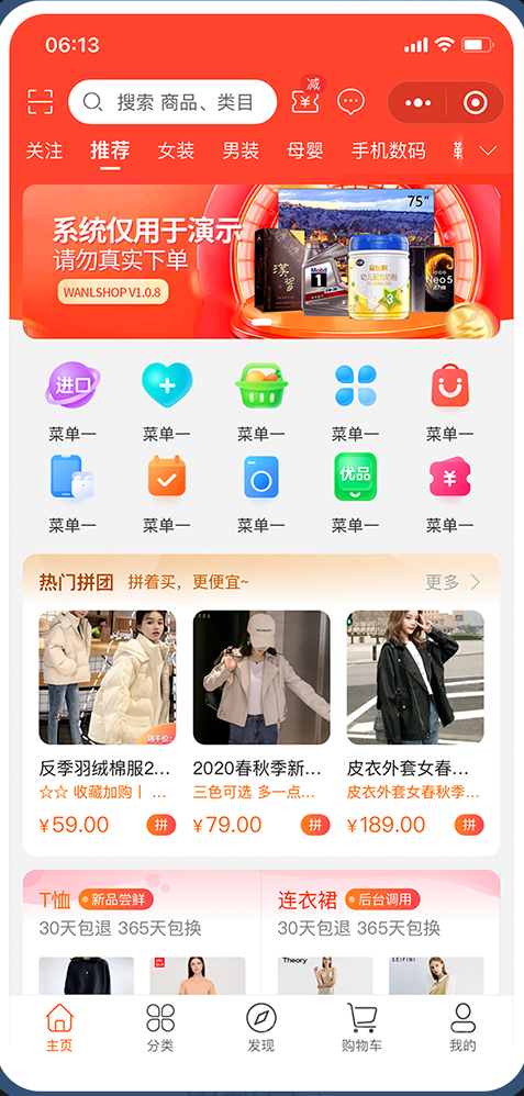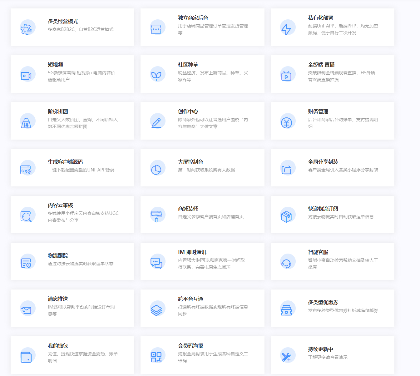 多终端(H5移动端、APP、微信小程序、微信公众号)、多用户商城系统拥有多种运营模式B2B2C/B2C,内置独立商家后台、商城装修、短视频、社区种草、全终端直播、阶梯拼团,智能客服等功能,一键下载配置完整的Uni-APP客户端工程源码,前后端无加密源码,方便自行二次开发,私有化部署!