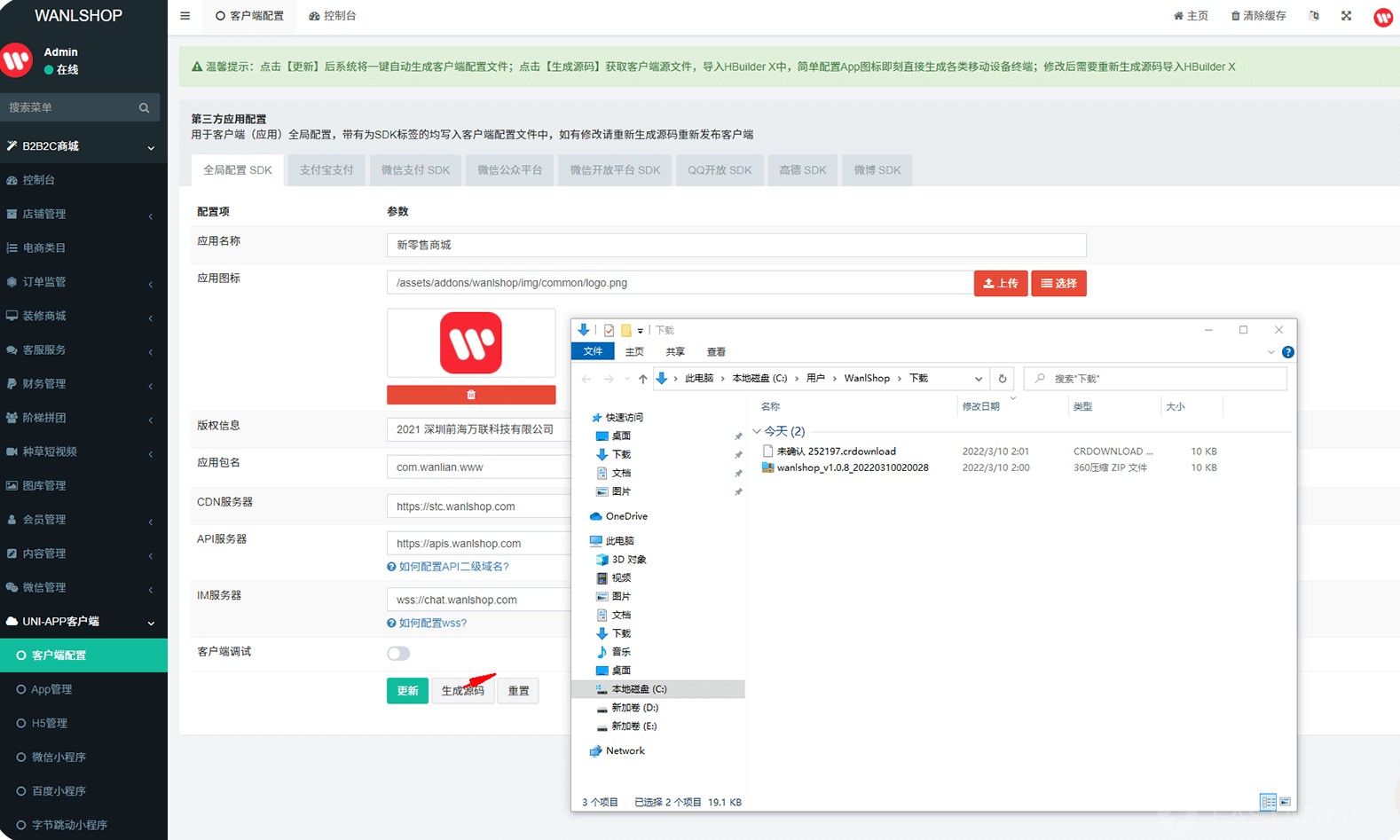 后台客户端配置完成后,点击生成源码,可获得对接好站点的 uni-app 工程文件,一键发行快速开展业务