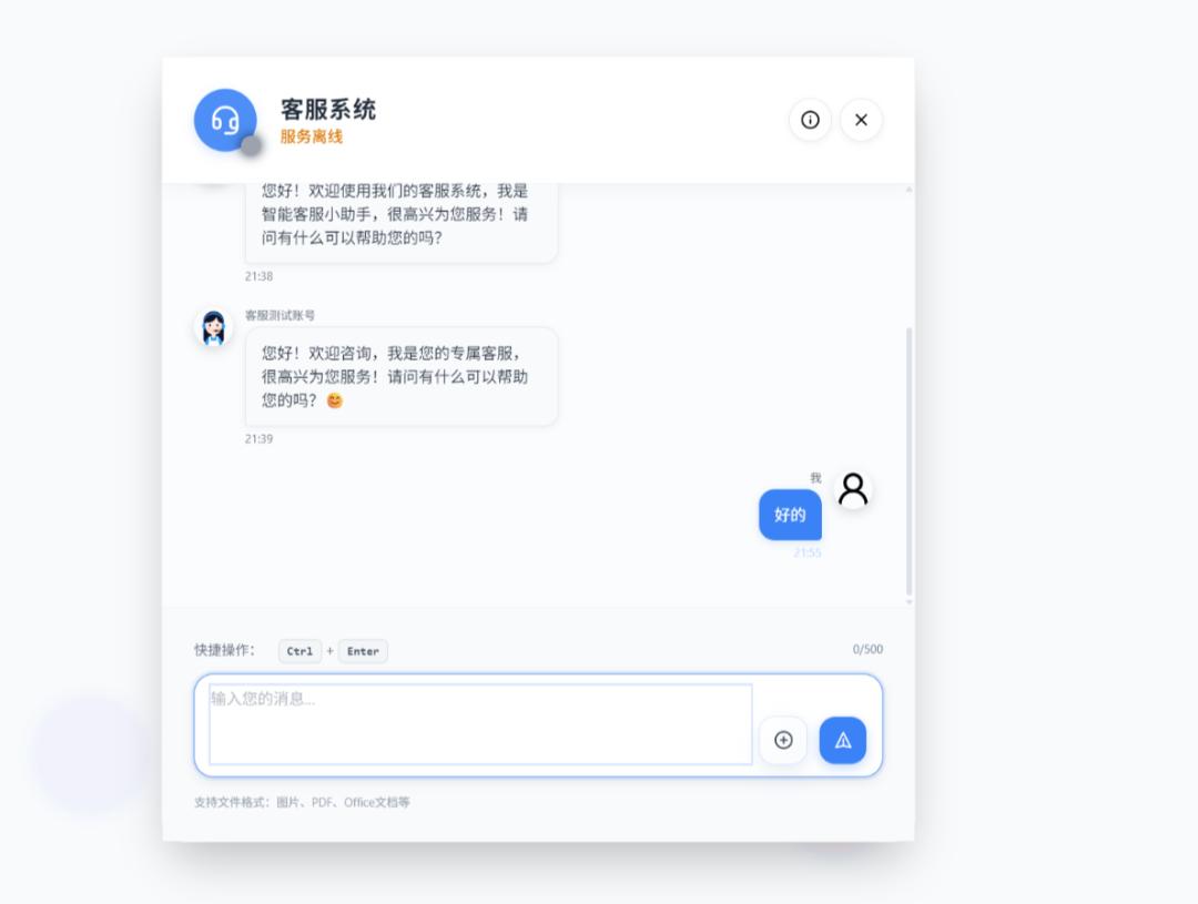 4.访客通过网页可直接发起聊天,支持文字、图片(含截图)发送;消息采用WebSocket技术实现毫秒级实时推送,聊天窗口支持自定义尺寸、位置及按钮文案(如“在线咨询”“售后客服”),适配不同网站风格。网页内嵌集成聊天组件