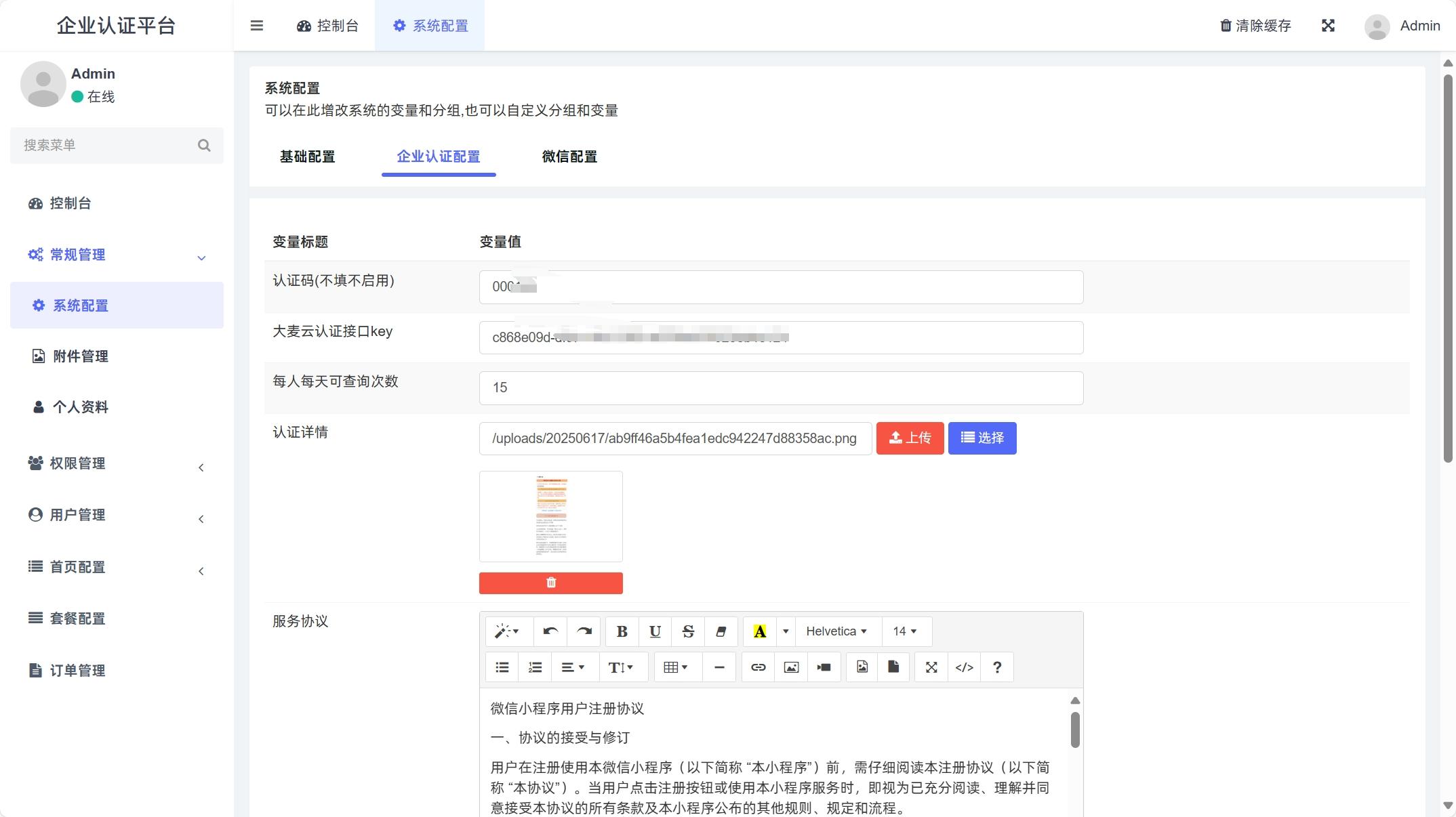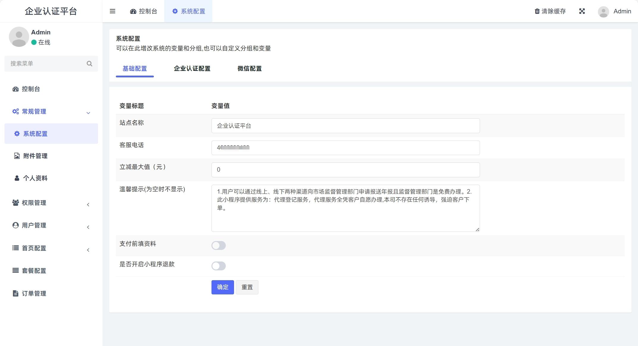 支持多项目添加,支持开关小程序端申请退款,支持设置认证码,支持设置每日可查询次数、支持设置随机立减