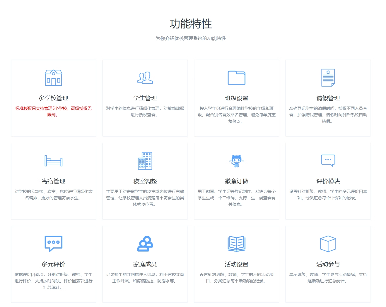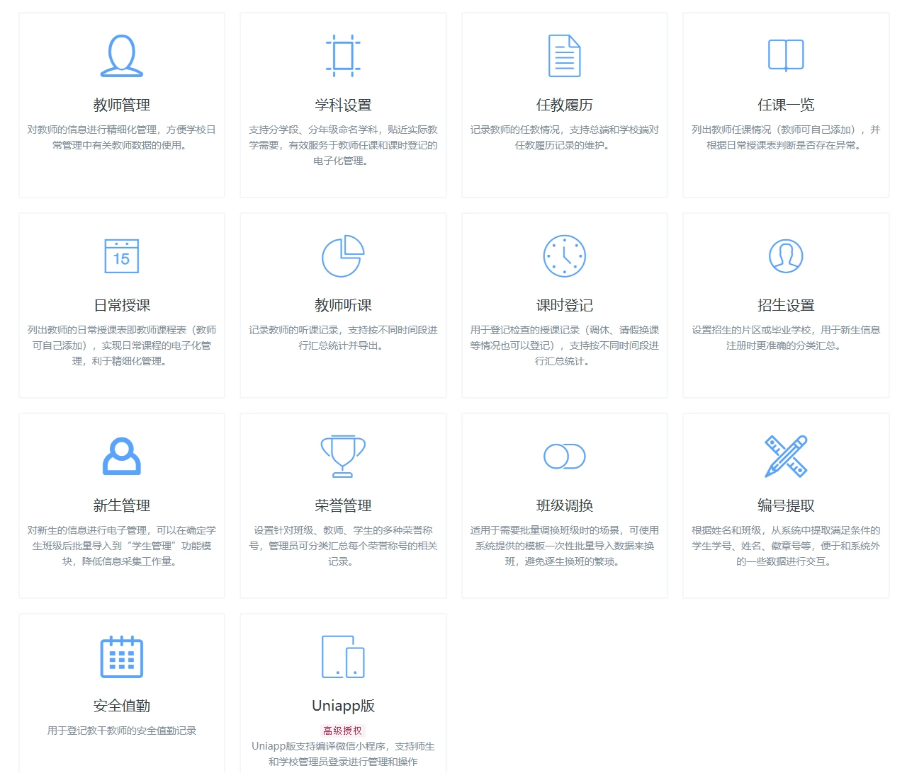优校管理系统(简称优校管)是基于ThinkPHP进行开发的中小学信息化管理系统,拥有PC版、UniAPP版(高级授权)。支持微信小程序、H5等多平台,主要用于信息管理、教学管理、素养评价,支持多个学校(标准授权限5个,高级授权无限制)。
