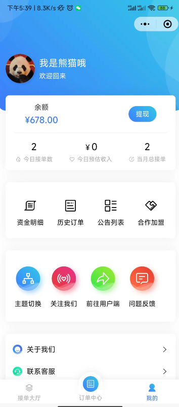 - 余额与收入:实时查看账户余额、今日接单数、今日预估收入及当月总接单量。