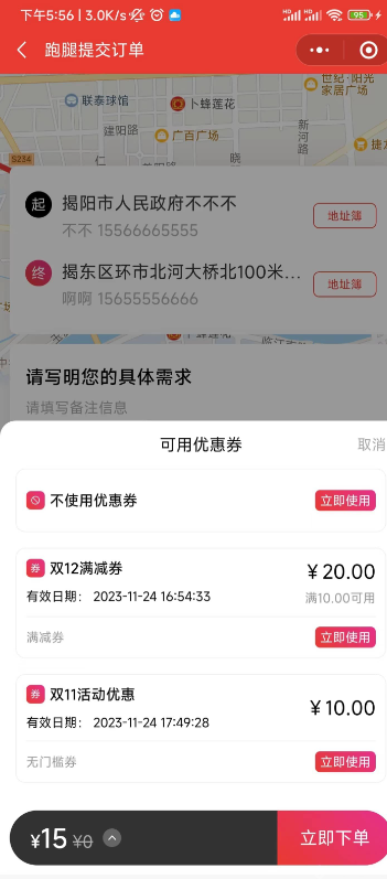 - 预约配送:支持选择 “立即送达” 或 “预约时间” 取件 / 送达,适配计划性需求。