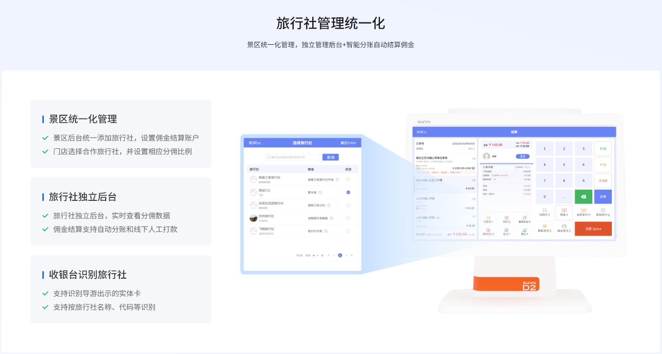 7.旅行社管理:独立管理后台、收银台绑定结算,抽取门店佣金等;