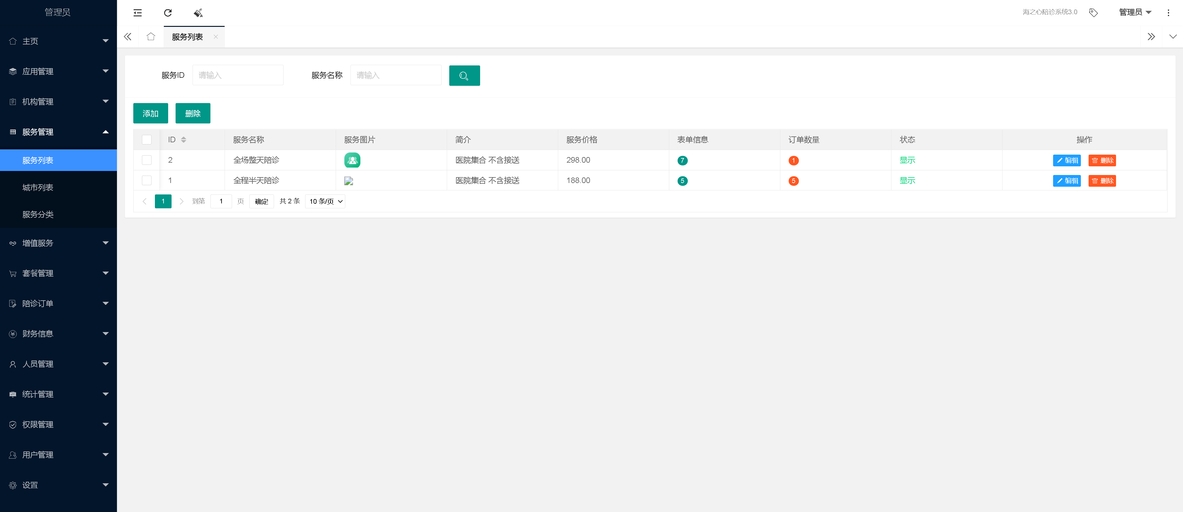 陪诊机构、陪诊服务(挂号、就诊、检查、缴费等)、挂号科室、服务列表、服务城市、服务分类、增值服务(规格、价格),陪诊订单,陪诊套餐、套餐订单、套餐消费记录,支付订单、资金明细、提现订单、陪诊员入驻、陪诊员接单、服务订单、统计管理、权限管理、用户管理、系统设置