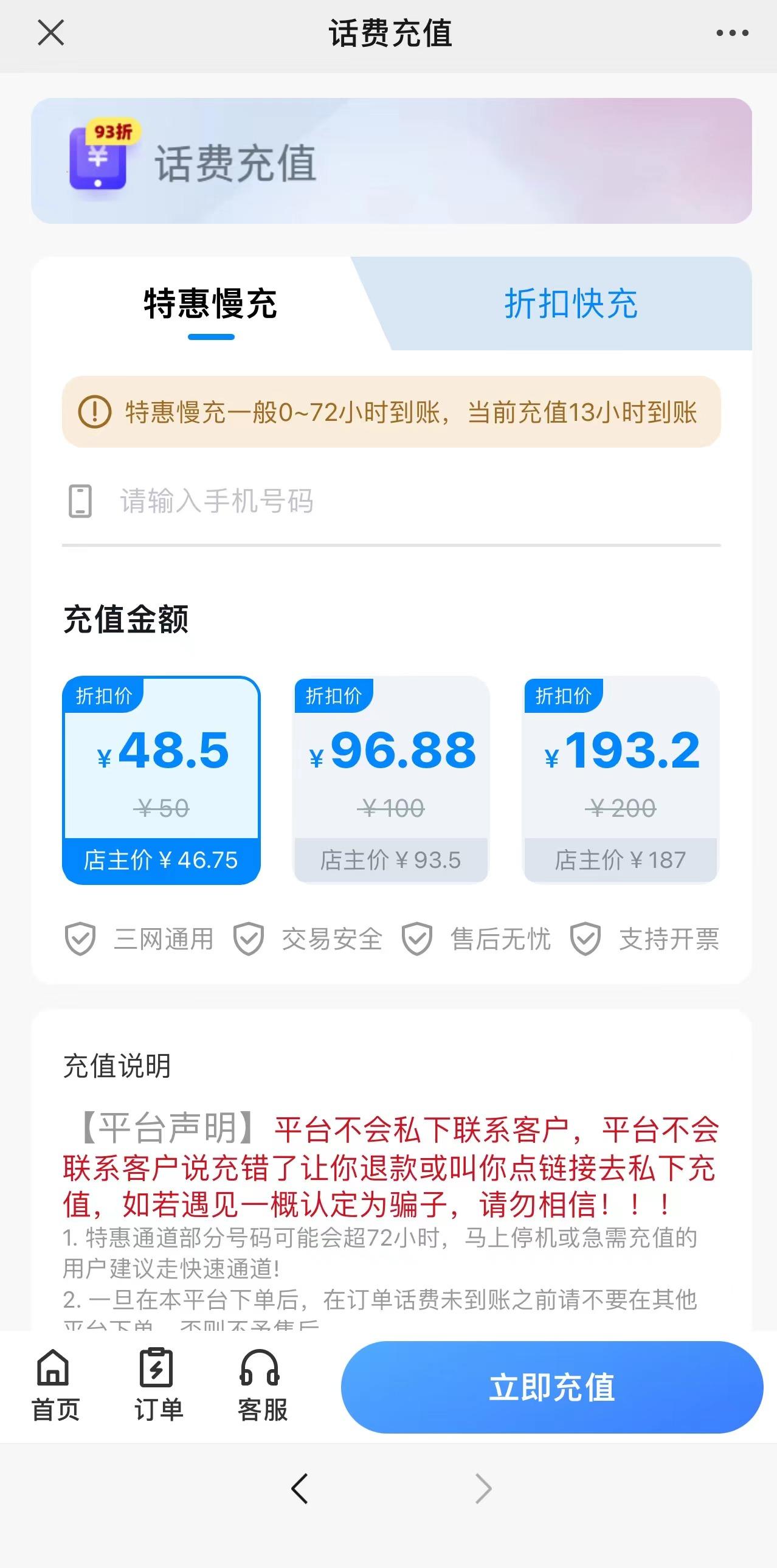 例1:普通用户充值商品花费96元,成本价92元,单笔订单平台可赚4元利润。