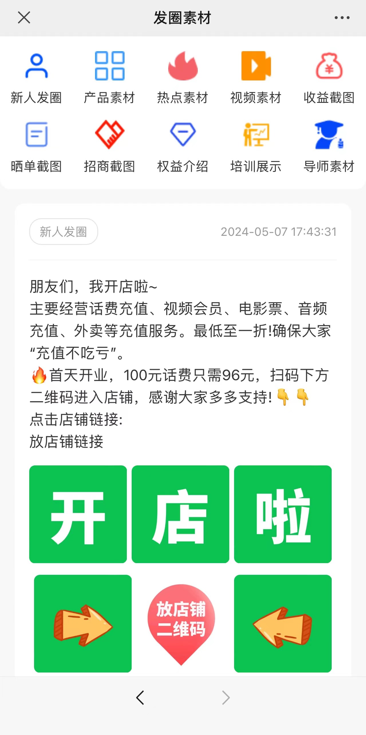 五:特色营销功能:省黔生活为帮助客户更好运营,满足广大客户对于营销的需求,设立了素材学院板块,供平台用户和店主使用,目前添加的板块有:①新人发圈 ②产品素材 ③热点素材 ④视频素材 ⑤收益截图 ⑥晒单截图 ⑦招商截图 ⑧权益介绍 ⑨培训展示 ⑩导师素材