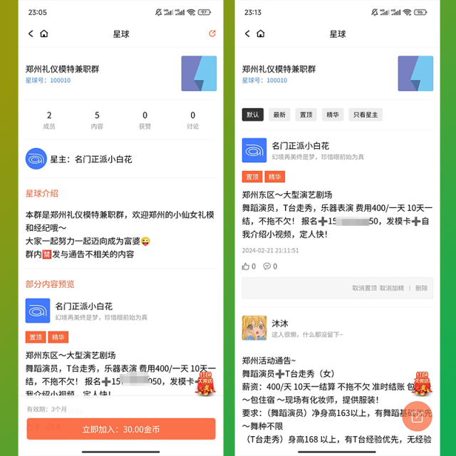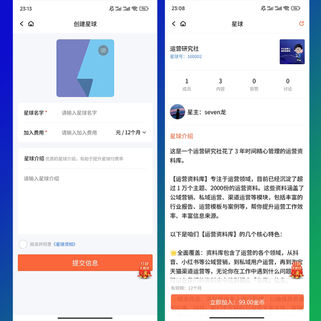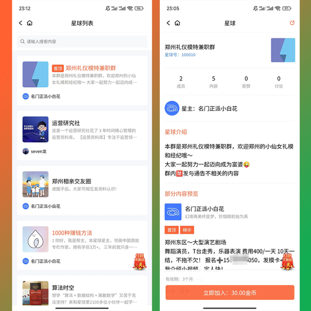 平台支持星球名字变色,在列表中显著显示,星主需付费变色星球。变色费用可在后台设置。