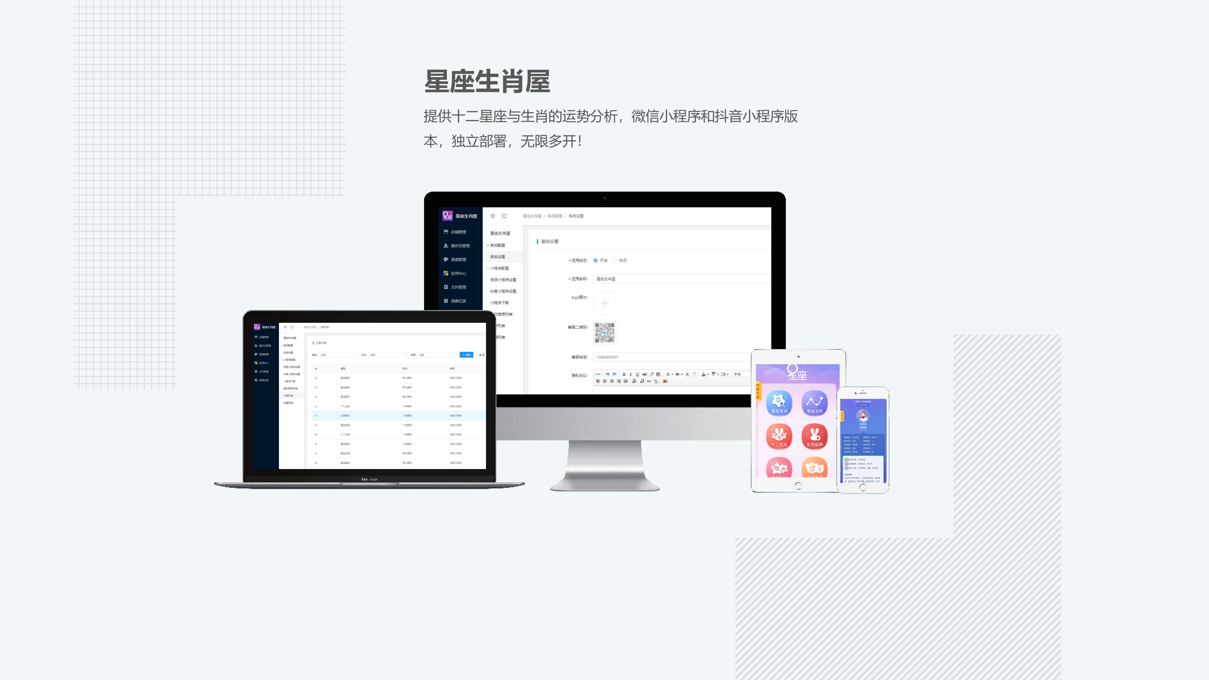 管理端安装并上架「星座生肖屋」应用后,店铺端、平台端在【应用】页面购买或免费使用