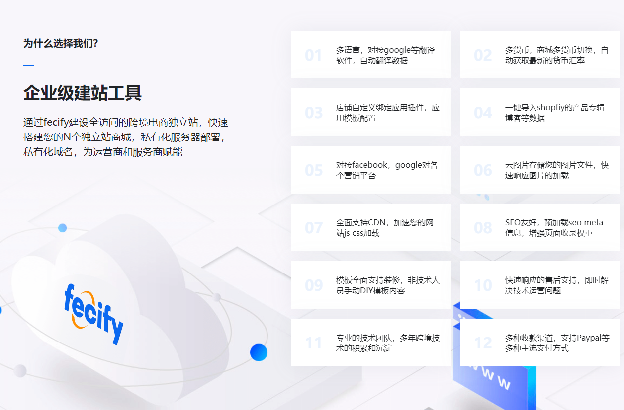 企业级建站工具,通过fecify建设全访问的跨境电商独立站,快速搭建您的N个独立站商城,私有化服务器部署,私有化域名,为运营商和服务商赋能