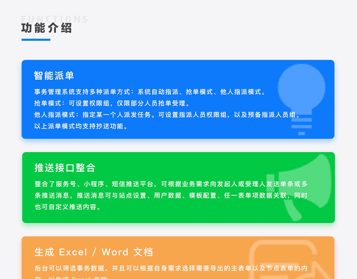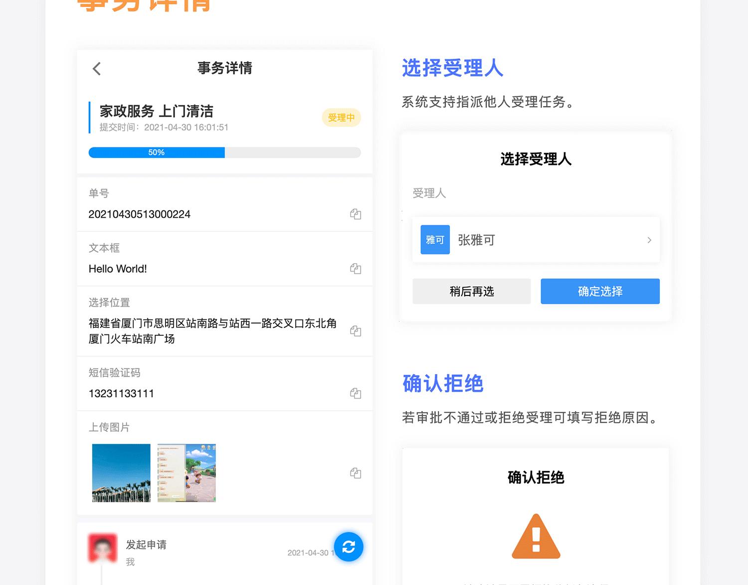 支持自定义推送:整合了服务号、小程序、短信推送平台,可根据业务需求向发起人或受理人发送单条或多条推送消息,推送消息可与站点设置、用户数据、模板配置、事务任一表单项数据关联。