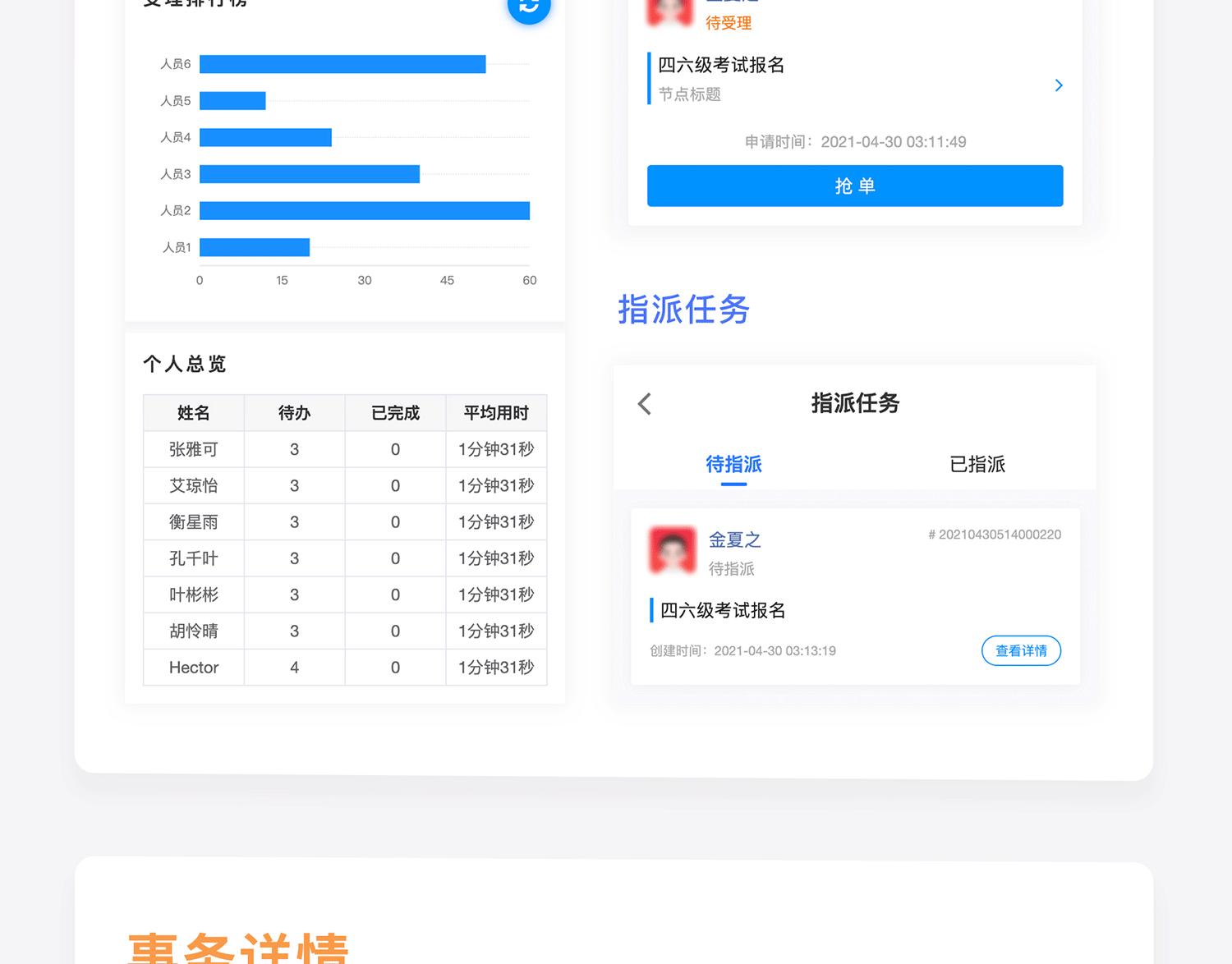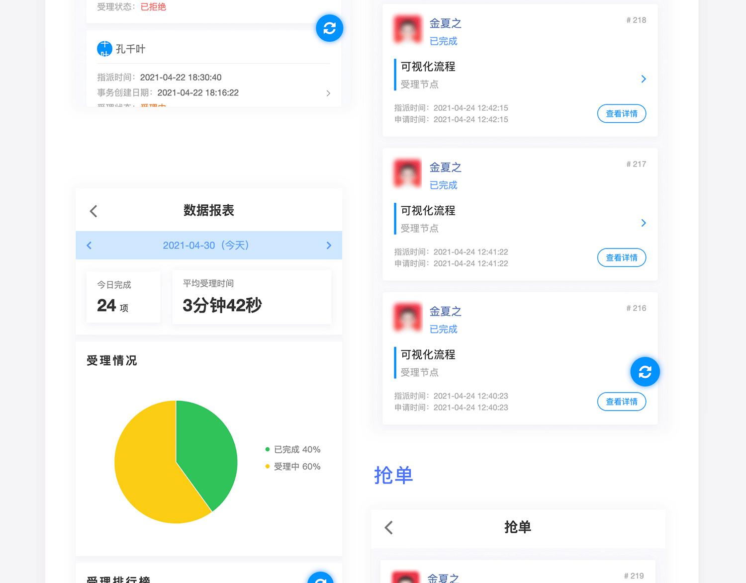 灵活的流程设计:可将表单派发给多位人员协同受理,流程支持指定模式、自选模式、抢单模式、部门主管、发起人主管、节点负责人等指派方式。在设置指派方式时,可根据受理人员、部门进一步调整指派范围。同时支持转派,转派可设置转派次数与范围。
