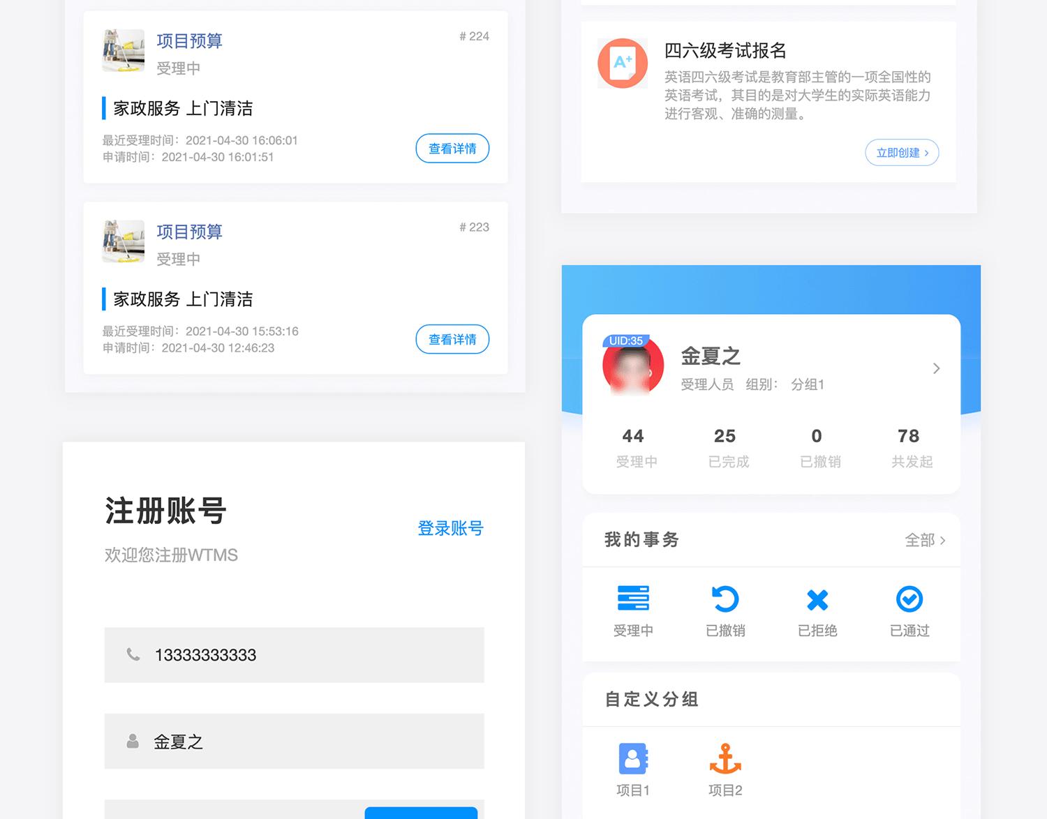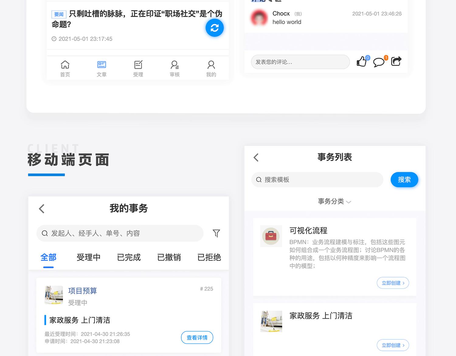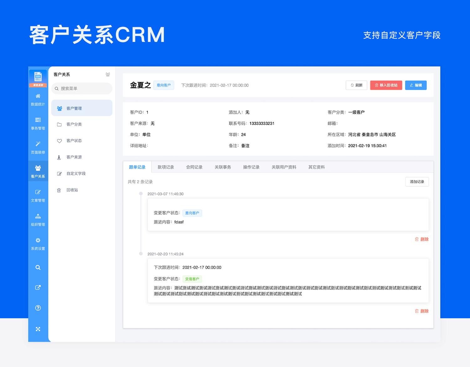 引入 CRM:后台可添加客户并关联至某一用户,当此用户发起事务时将自动关联到客户信息,也可手动关联非此客户提交的事务;客户资料字段可自定义并设计规则。(客户公海、款项追踪正在开发)