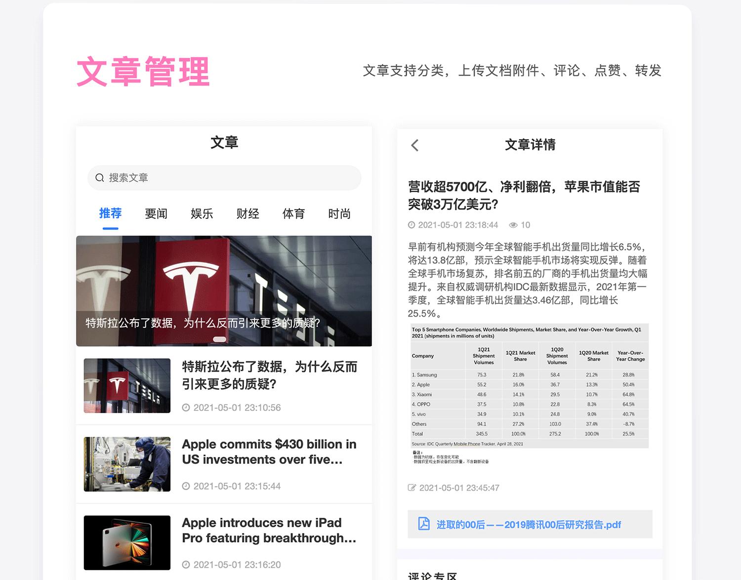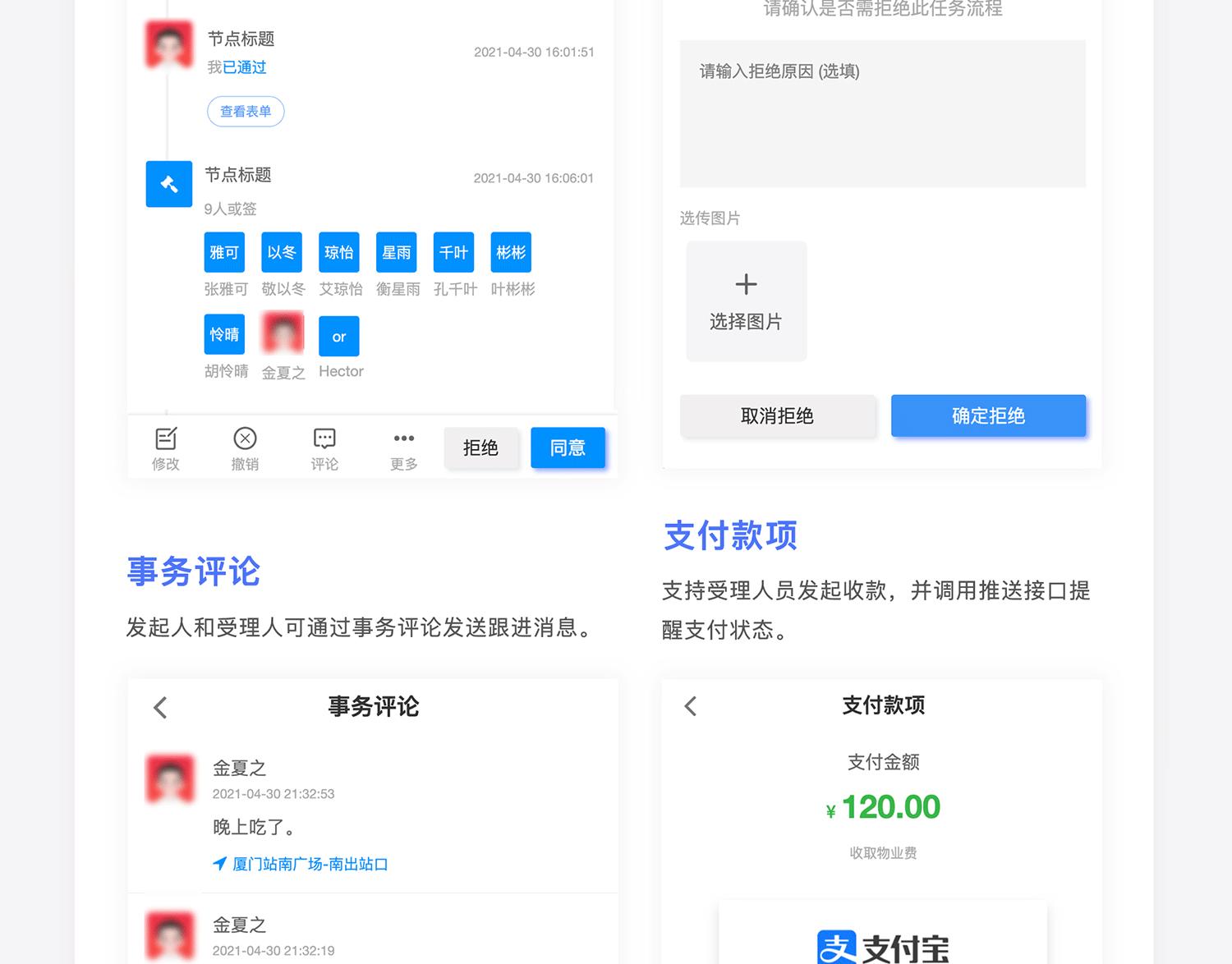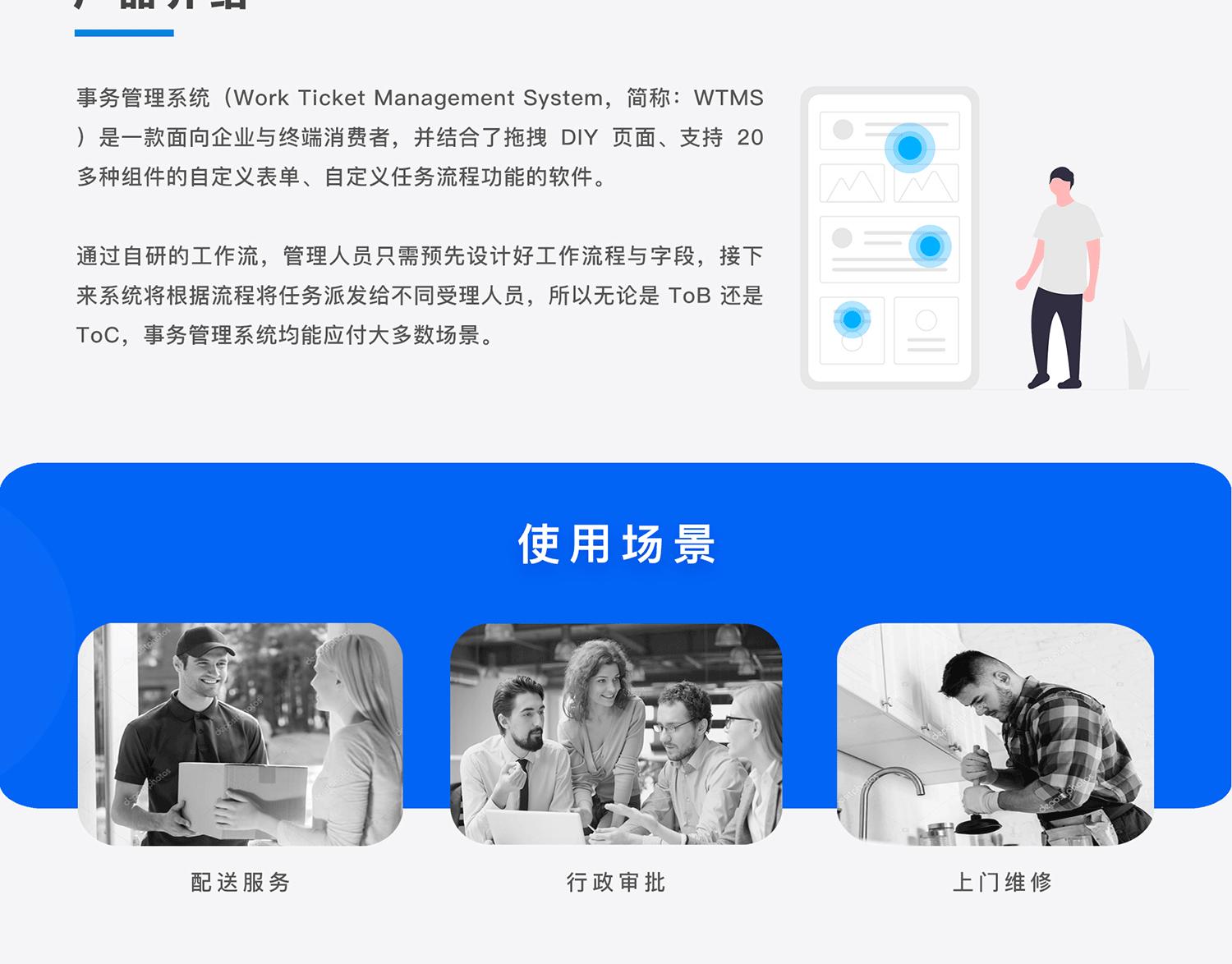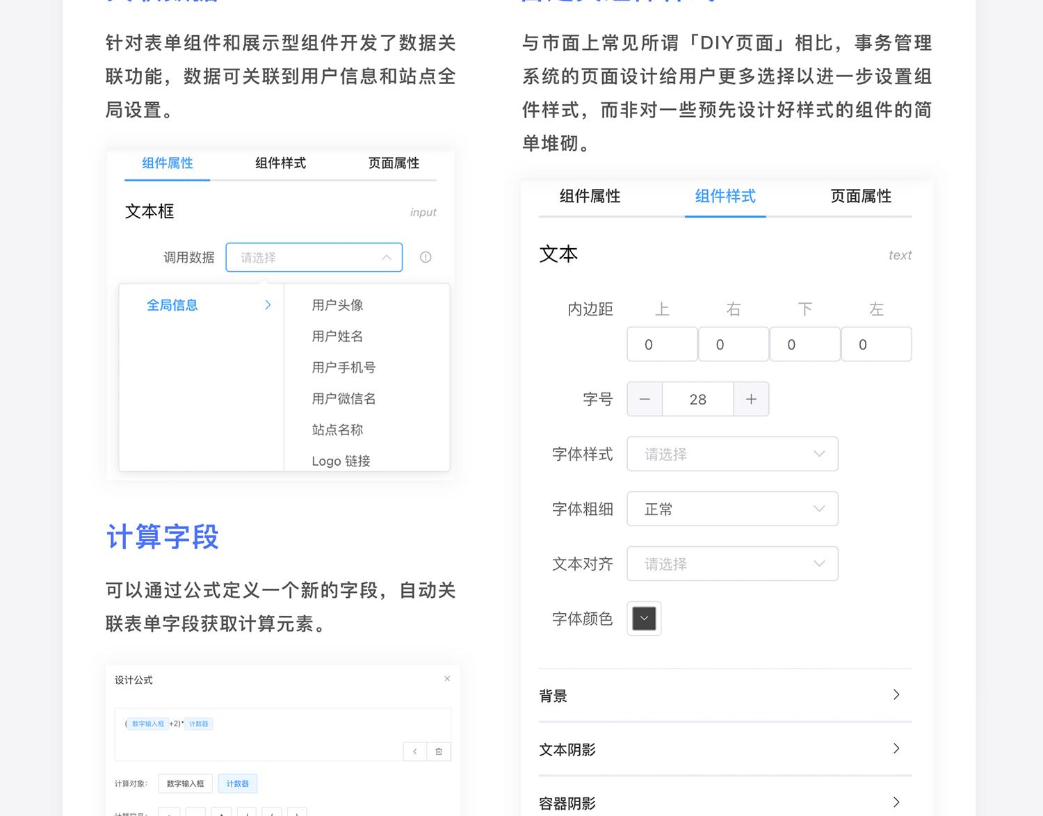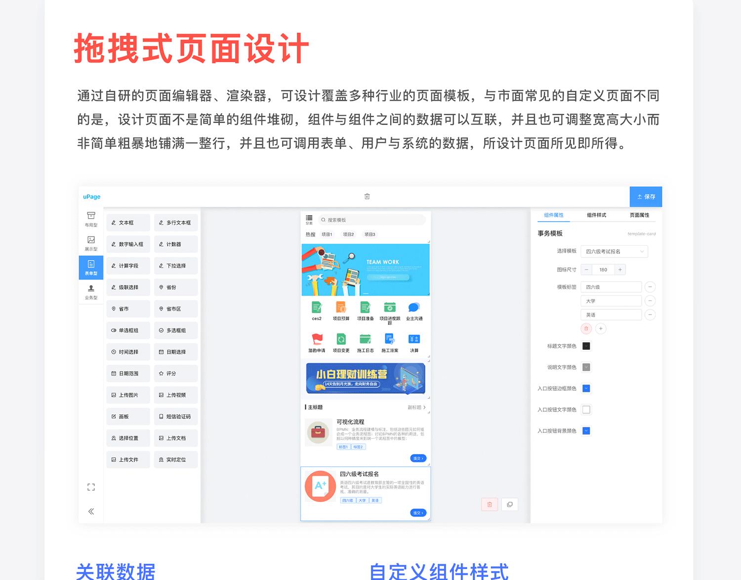 自定义拖拽 DIY 页面:通过自研的页面编辑器、渲染器,可设计覆盖多种行业的页面模板,与市面常见的自定义页面不同的是,设计页面不是简单的组件堆砌,组件与组件之间的数据可以互联,并且也可调整宽高大小而非简单地铺满一整行,并且也可调用表单、用户与系统的数据,所设计页面所见即所得。