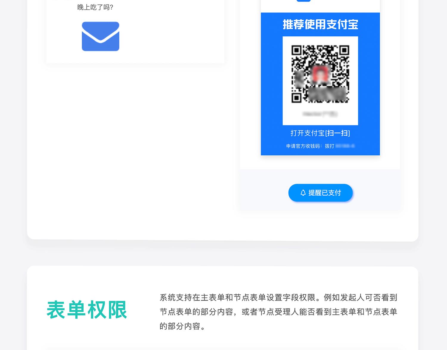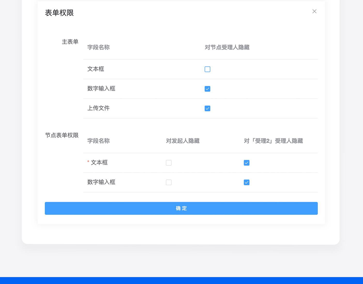 细致的表单权限配置:后台可配置发起人以及每个节点的负责人对主表单、其它节点受理表单的能见范围。