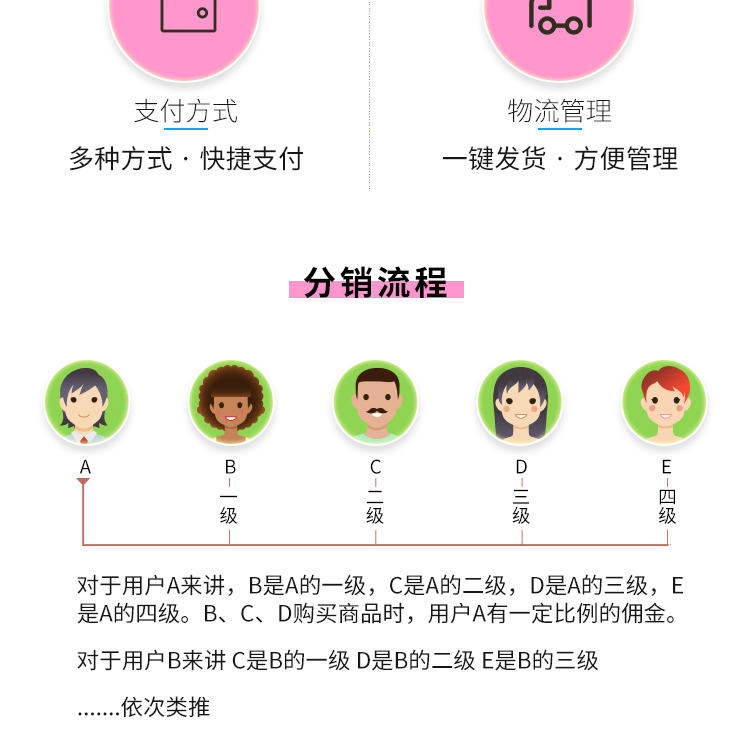 微信端在线商城,采用微支付付款,会员注册后,可以分享给其他好友或朋友圈,当其他好友注册后,即成为你推荐的会员。在这些会员成功购买商品后,你将收到一定比例的佣金,推荐不同层次的会员,你将获取不同比例的佣金,佣金可以再次消费,或者可以提现(可直接提现至银行卡或提现至微信钱包)