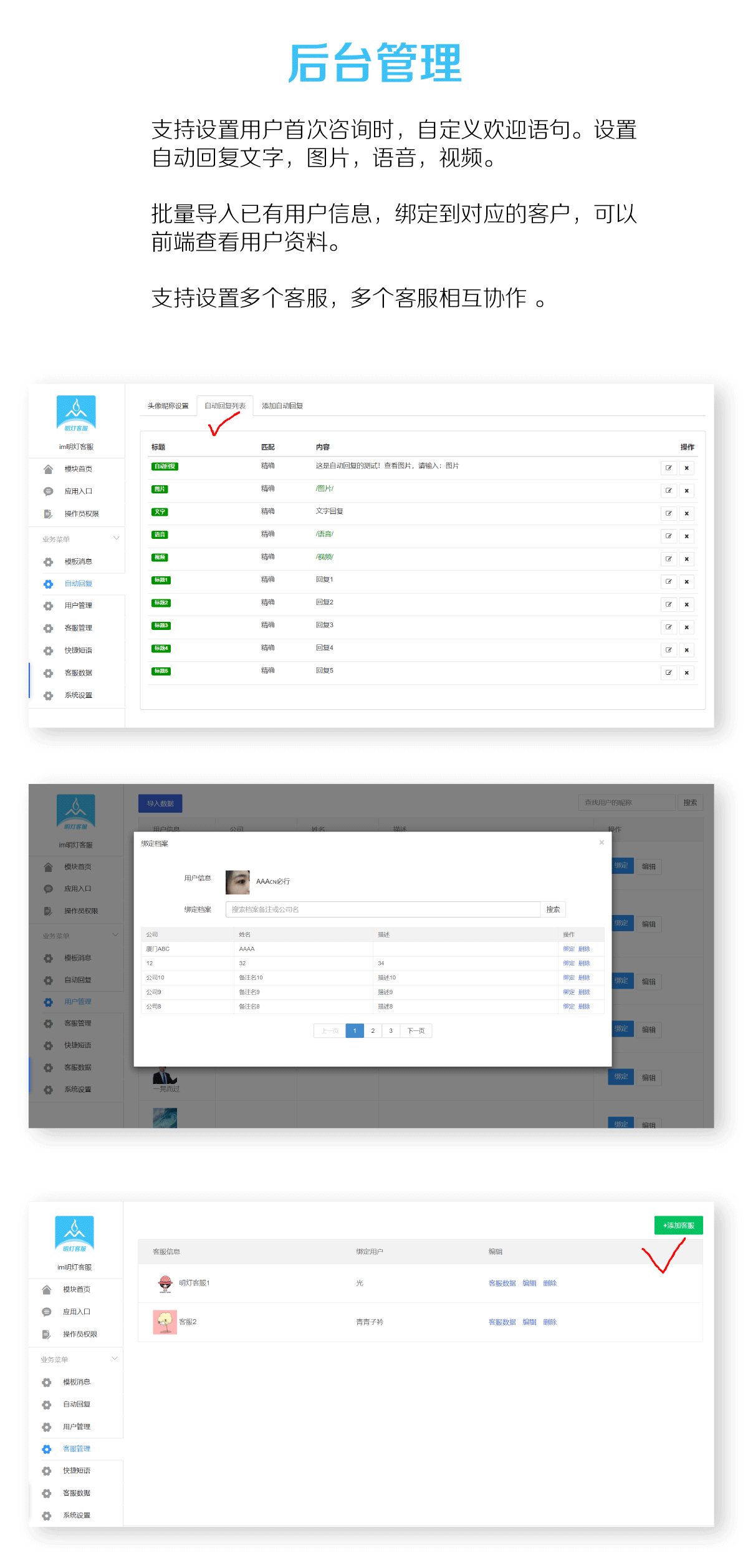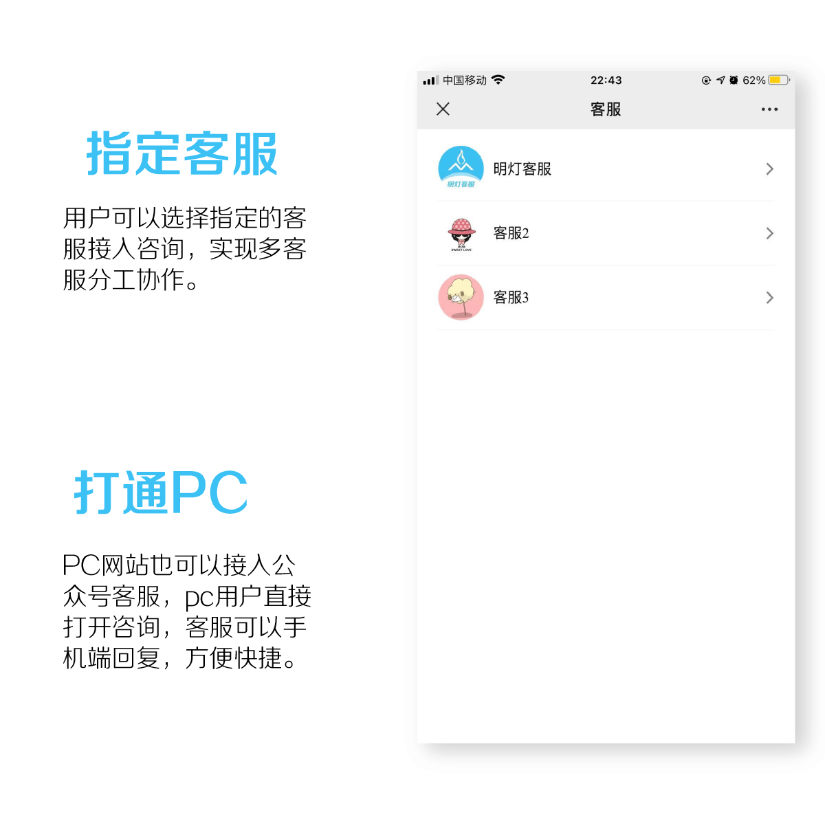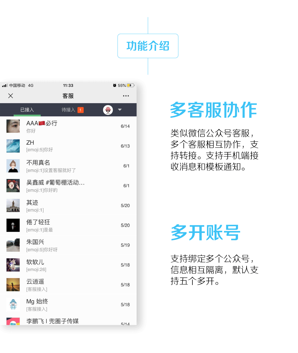 多客服协作:类似微信公众号客服,多个客服相互协作,支持转接。