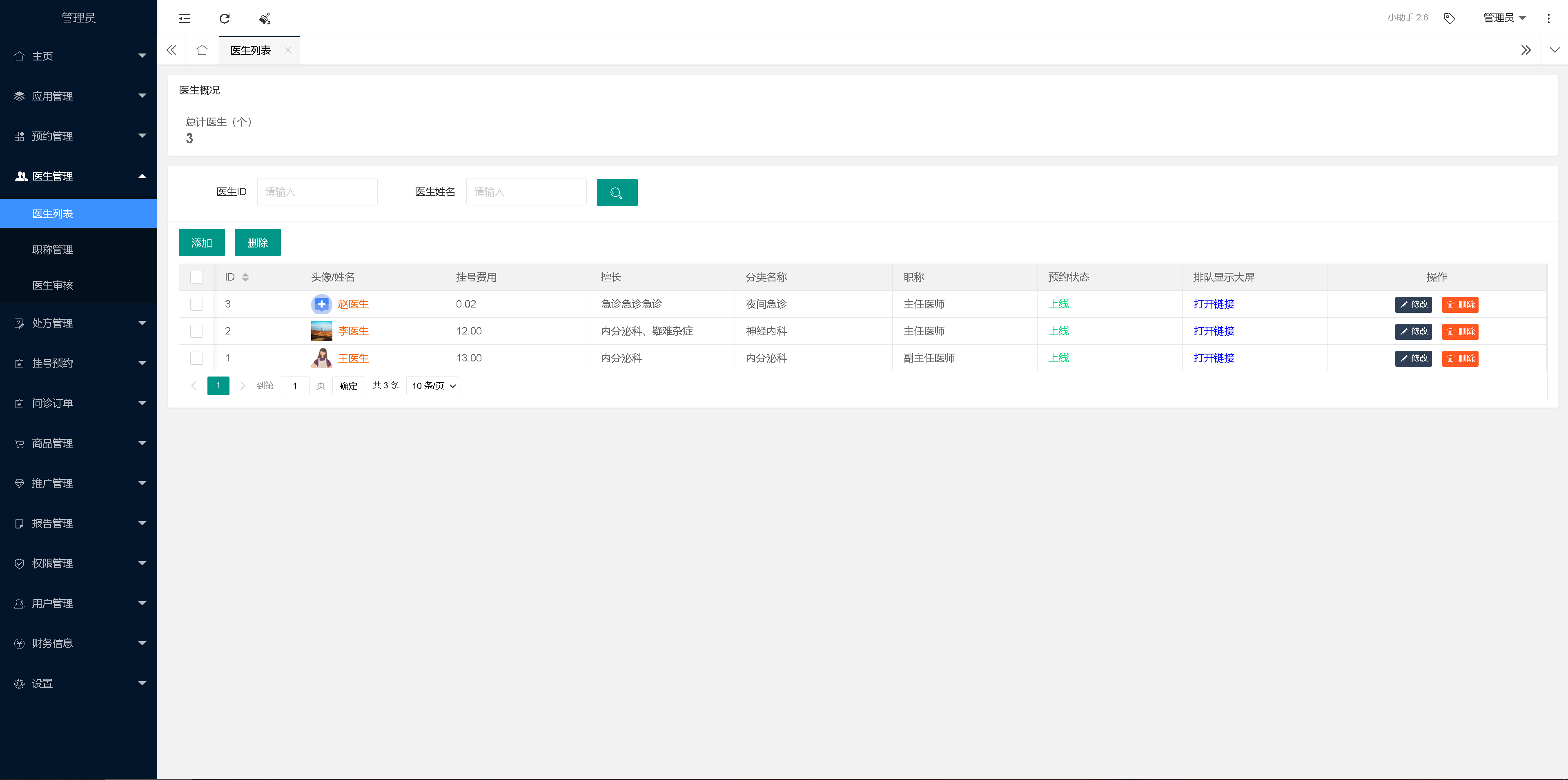 挂号科室、预约时间、医生列表、职称管理、药品管理、处方管理、病例管理、挂号订单、挂号叫号、问诊订单、问诊评价、商品管理、推广管理、报告查询、财务管理、统计管理、权限管理、用户管理、系统设置