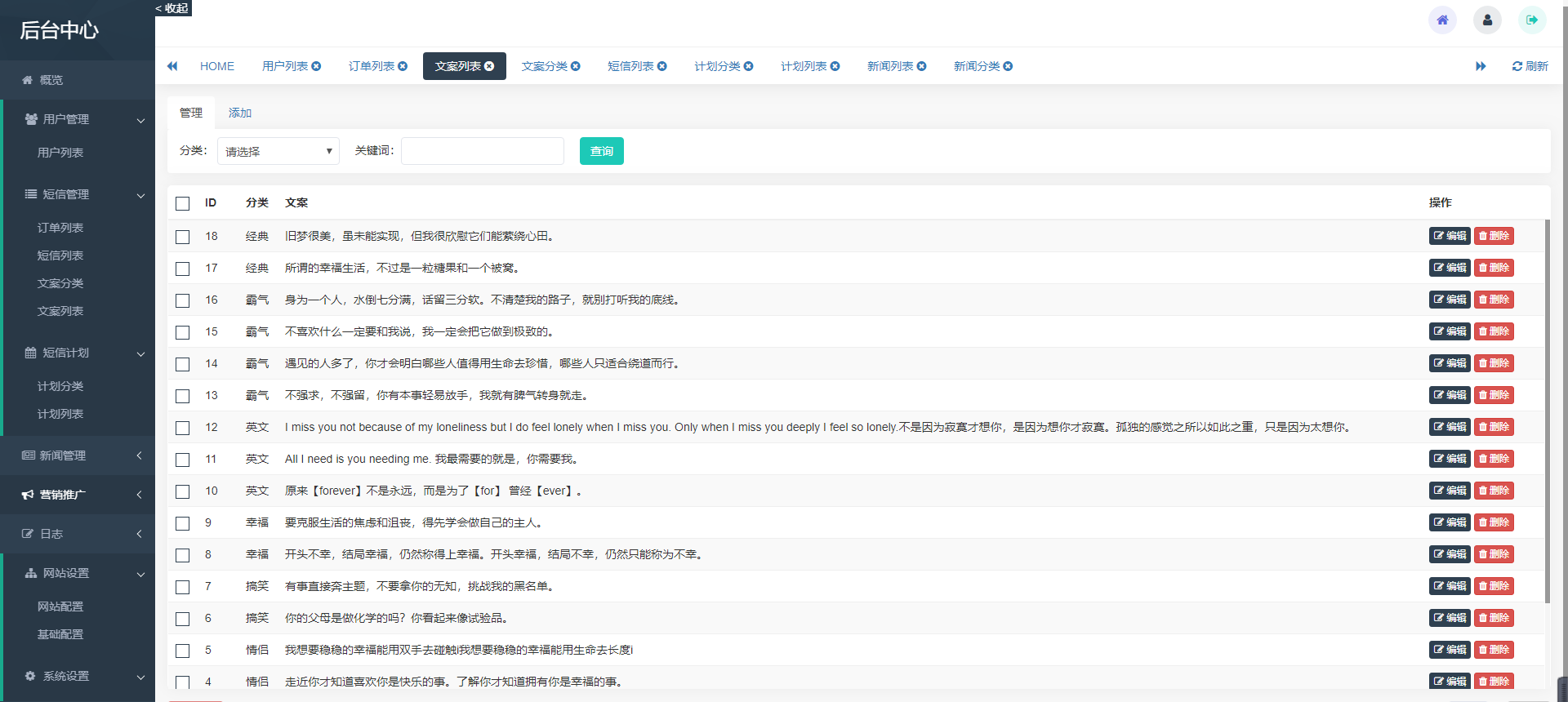 短信计划:支持后台新增短信计划,自定义价格和字数等,每天定时下发(v1.2新增)