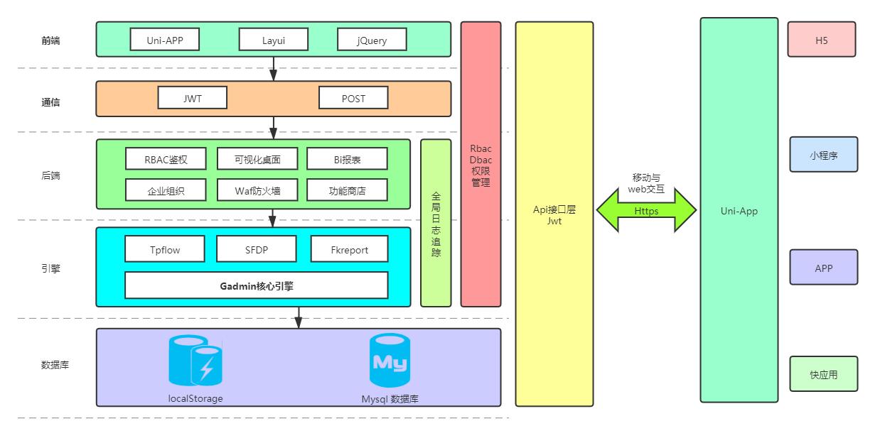Gadmin 企业级开发平台现有全端适配APP;多级多权限架构;企业级组织架构;Tpflow流程引擎快速驱动;SFDP超级表单开发平台;企业级报表开发平台;个性化桌面系统等述事项超级功能;
