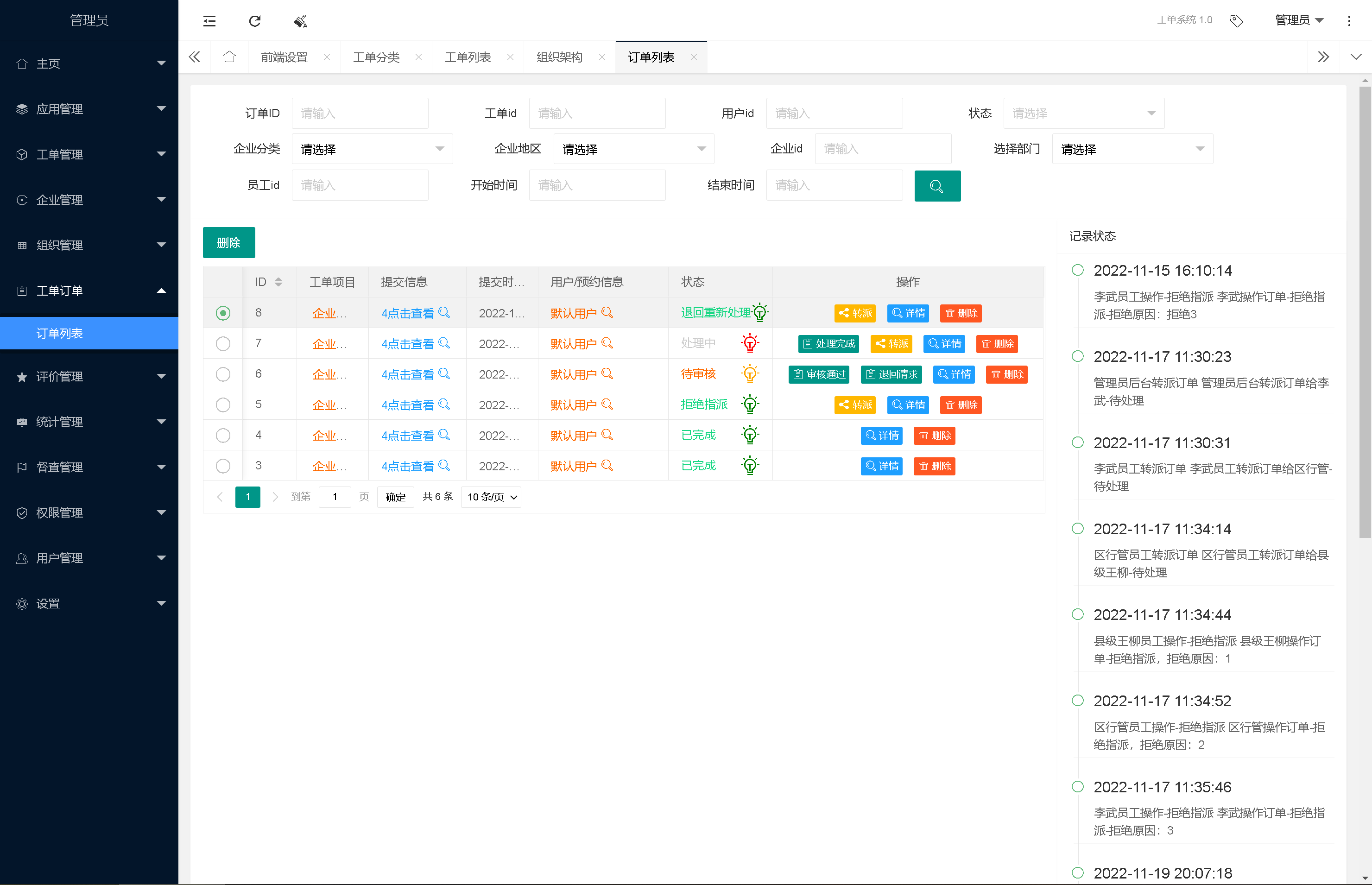 审批流程、派单转单、流程管理、审核订单,拒绝接收工单,流程转派